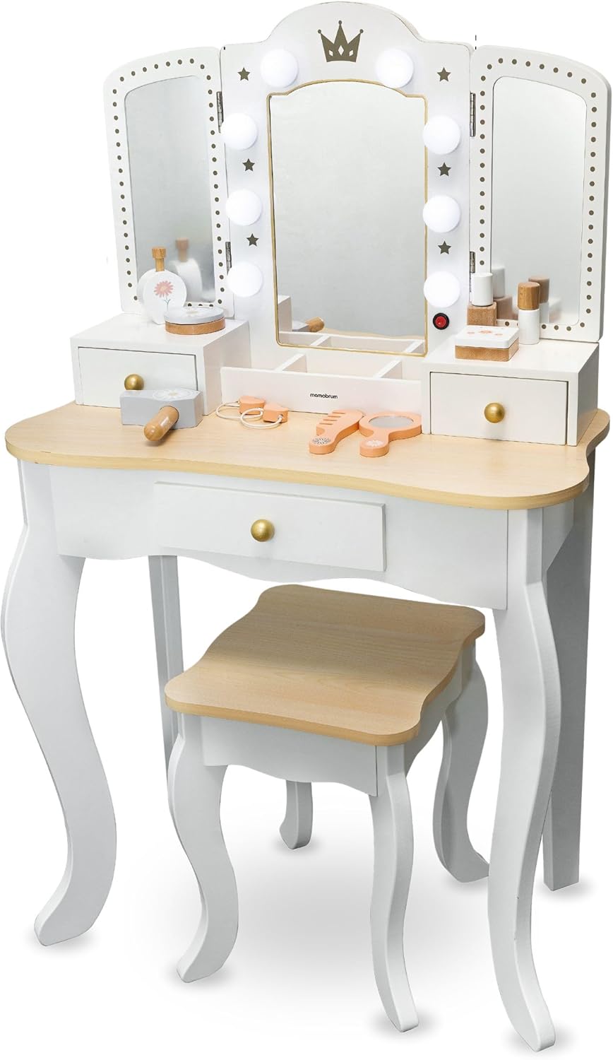 Coiffeuse Enfant en Bois avec Tabouret & Miroir LED – Maquillage Enfant +3 ans avec Tiroir & Accessoires