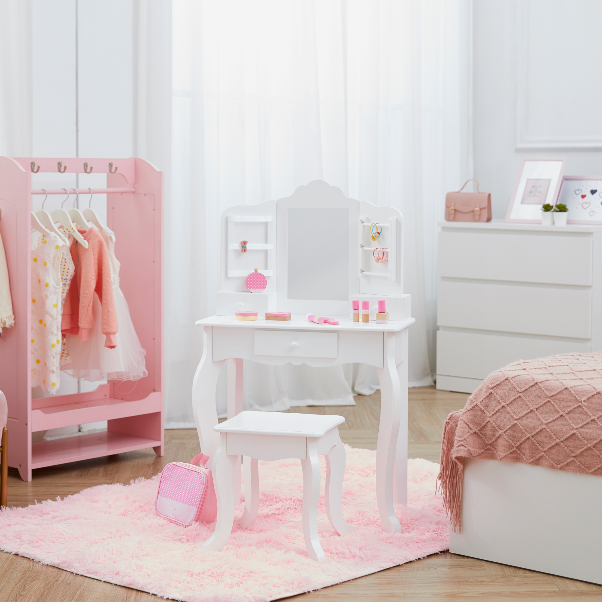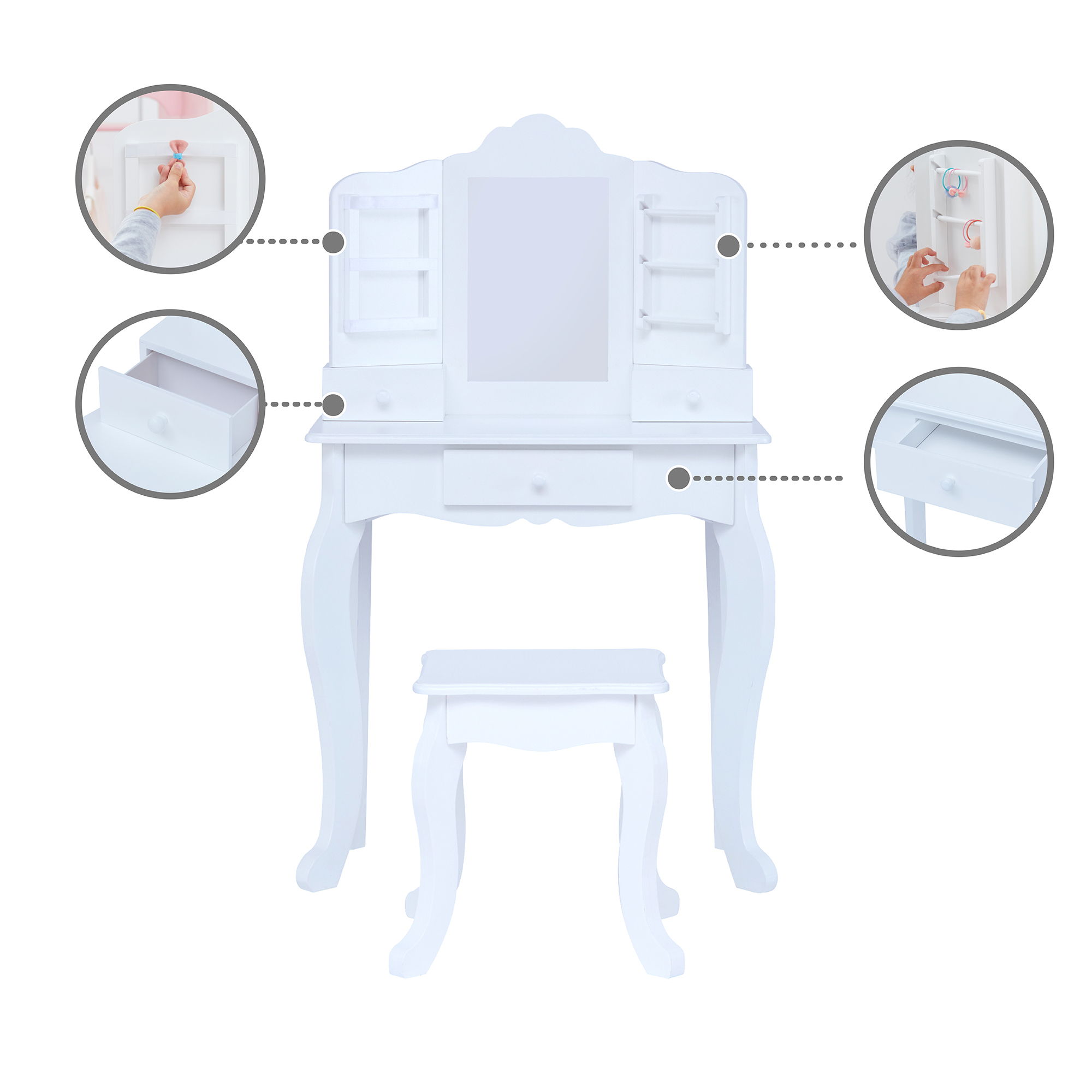 - DETAILS : Complètera à merveille une chambre d’enfant ou salle de jeux. Cette ravissante coiffeuse enfant Anna toute blanche comprend un design aux pieds galbées, un miroir incassable et un tabouret blanc assorti.