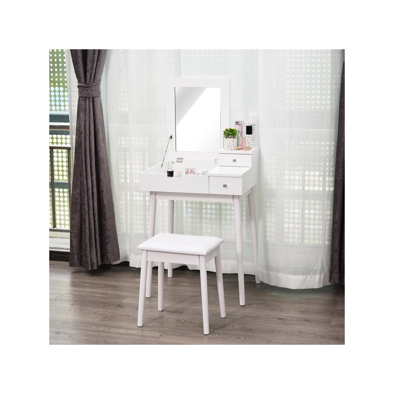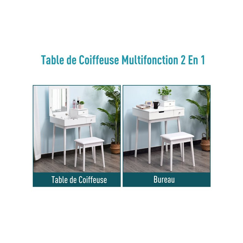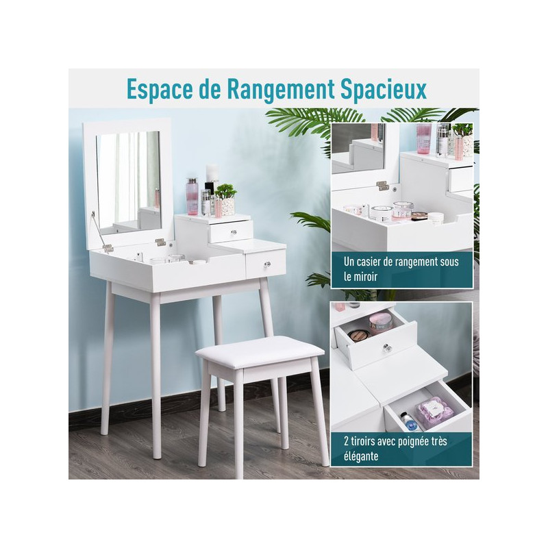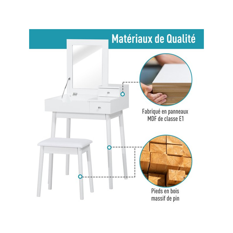 Pratique et élégante la coiffeuse Nathy de MYCOCOONING et son tabouret assorti vont devenir votre endroit préféré pour vous maquiller et vous coiffer. Un joli miroir rabattable sur le coffre de rangement est toujours disponible pour vous aider à utiliser vos cosmétiques. Replié, la table de maquillage peut servir de bureau d'appoint sans souci. La coiffeuse est également munie de 2 tiroirs latéraux pour garder à l'abri vos produits les plus fragiles. Couleur : blanc Matériaux principaux : MDF, bois massif de pin, revêtement synthétique Dim. coiffeuse : 60L x 50l x 86H cm Dim. tabouret : 39L x 29l x 44H cm Dim. miroir : 30L x 40l cm Dim. tiroirs : 15L x 18l x 5H et 29L x 15l x 6,8H cm Épaisseur coussin : 2 cm Épaisseur panneaux : 1,2 cm Charge max. recommandée : 100 Kg (au total), 15 Kg (par tiroir) Livraison effectuée en 1 colis