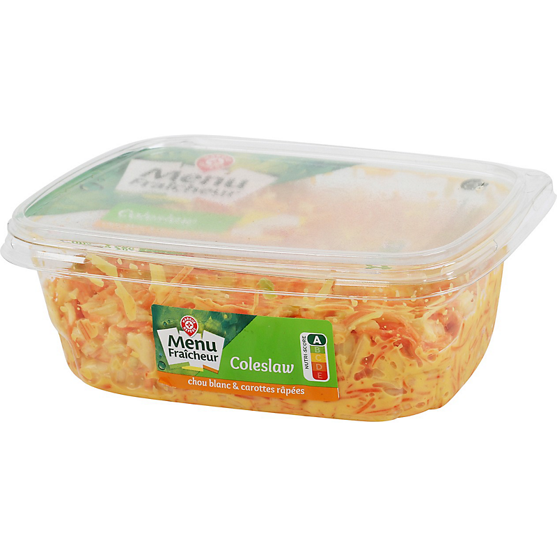 Ingrédients : Chou blanc 46 % ; carotte 30 % ; eau ; huile de colza ; vinaigre d'alcool ; oignon ; sucre ; sel ; MOUTARDE (eau, graines de MOUTARDE, vinaigre d'alcool, sel) ; amidon modifié de pomme de terre ; conservateur : E202 ; épaississant : gomme xanthane ; antioxydant : acide ascorbique ; jaune d'OEUF en poudre ; poivre ; sirop de glucose. Traces de céleri, gluten, fruits à coque et lait.