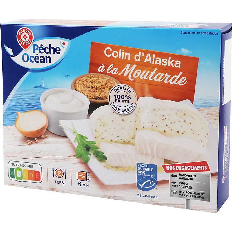 TRANCHES DE FILETS DE COLIN D'ALASKA* À LA MOUTARDE, SURGELÉES. *Qualité sans arête : bien qu'un soin tout particulier ait été pris pour éliminer toutes les arêtes, quelques unes peuvent exceptionnellement se retrouver dans ce produit. PECHE OCEAN