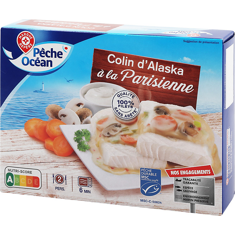 TRANCHES DE FILETS DE COLIN D'ALASKA* ACCOMPAGNÉES D'UNE SAUCE CRÉMEUSE AUX CHAMPIGNONS- SURGELÉES. *Qualité sans arête : bien qu'un soin tout particulier ait été pris pour éliminer toutes les arêtes, quelques-unes peuvent exceptionnellement se retrouver dans ce produit. PECHE OCEAN