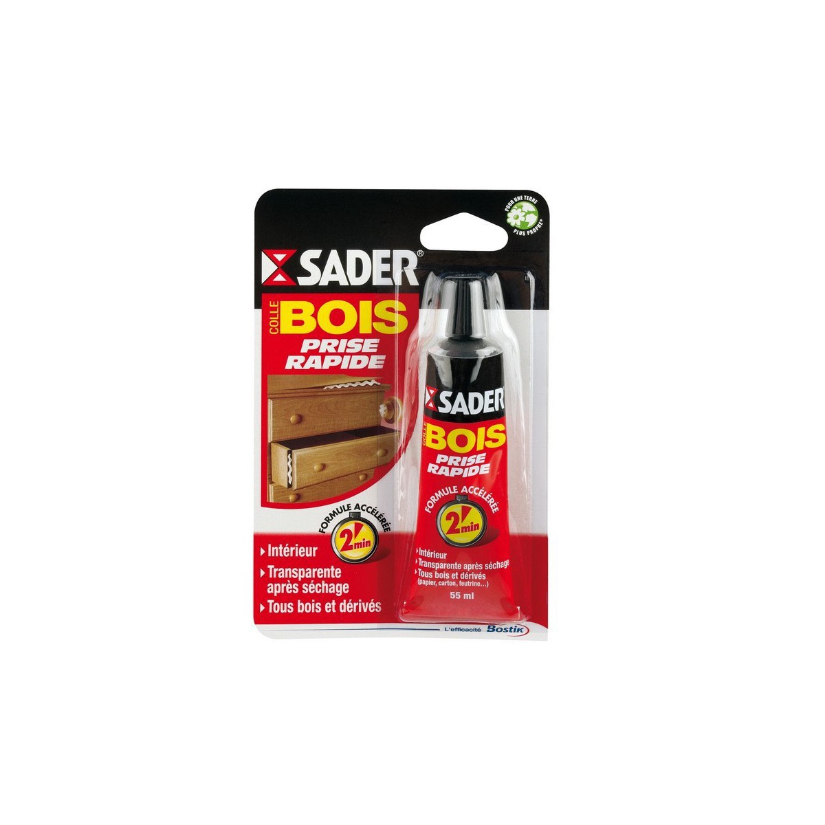 Colle à bois vinylique à prise rapide pour l'assemblage et le placage de tous les bois et leurs dérivés. Sans solvant, elle est recommandée pour tous les travaux de réparation ou de montage de meuble. Excellente résistance à l'arrachement. Prise rapide : 2 min. (jusqu'à 30 min. selon la porosité des matériaux et la température). Transparente après séchage, ne tache pas. Sans solvant, ininflammable. Contenance: Tube 55 ml Marque: Sader