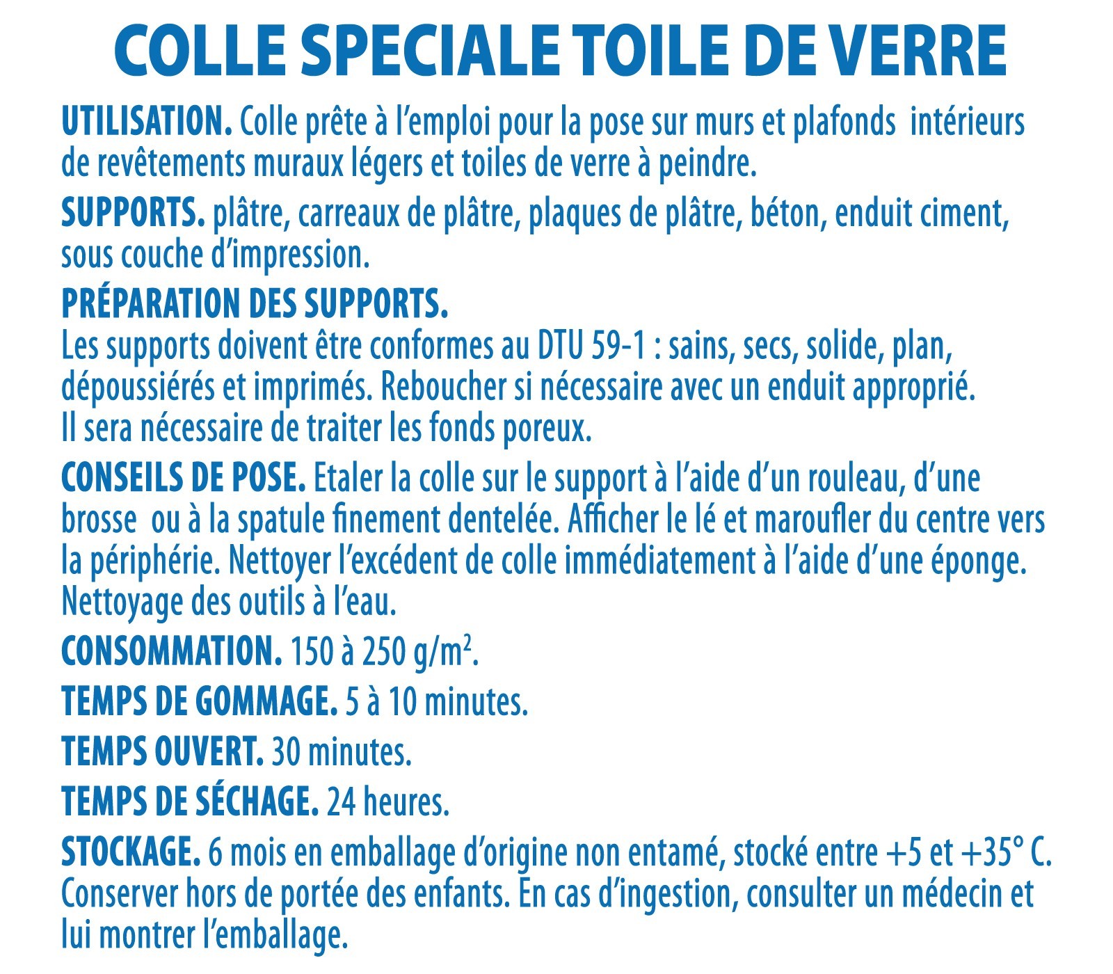 La colle pour toile de verre est une colle en dispersion aqueuse sans odeur, prête à l'emploi. Elle s’utilise en intérieur, sur les murs et les plafonds. Conditionnée dans un seau de 10 kilogrammes, la colle toile de verre convient pour les locaux humides.