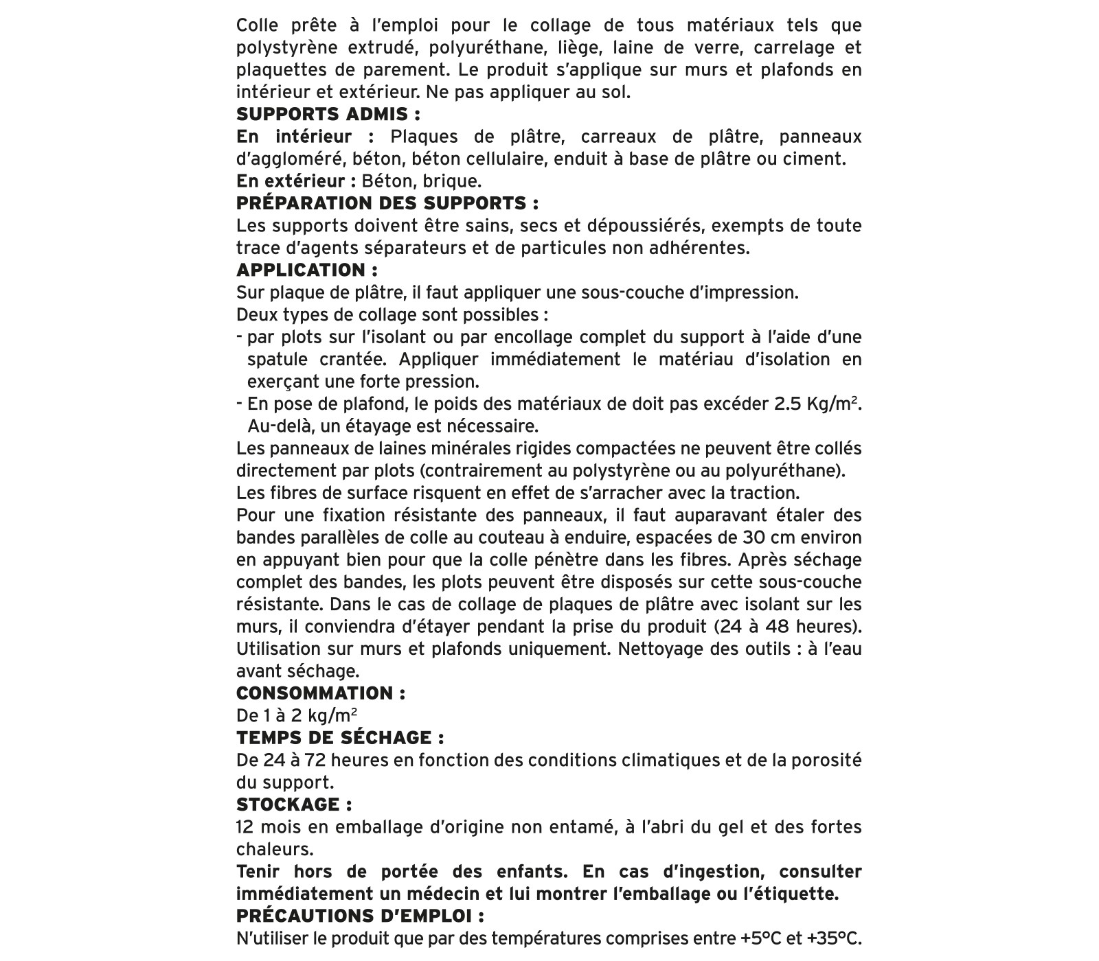 Colle prête à l'emploi pour le collage de tous matériaux tels que le polystèrene extrudé, polyuréthane, liège, laine de verre, carrelage et plaquette de parement