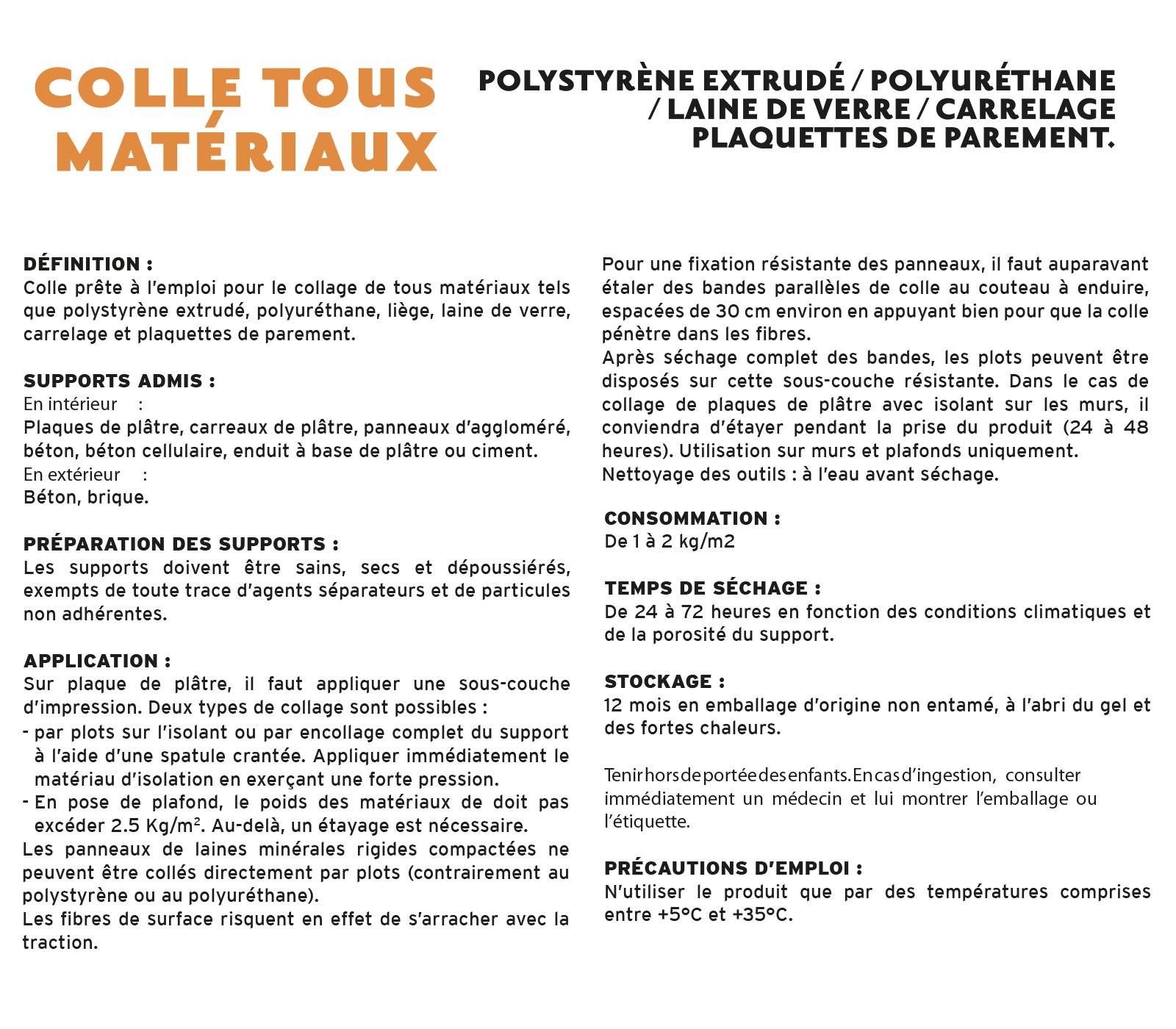 Colle prête à l'emploi pour le collage de tous matériaux tels que le polystèrene extrudé, polyuréthane, liège, laine de verre, carrelage et plaquette de parement