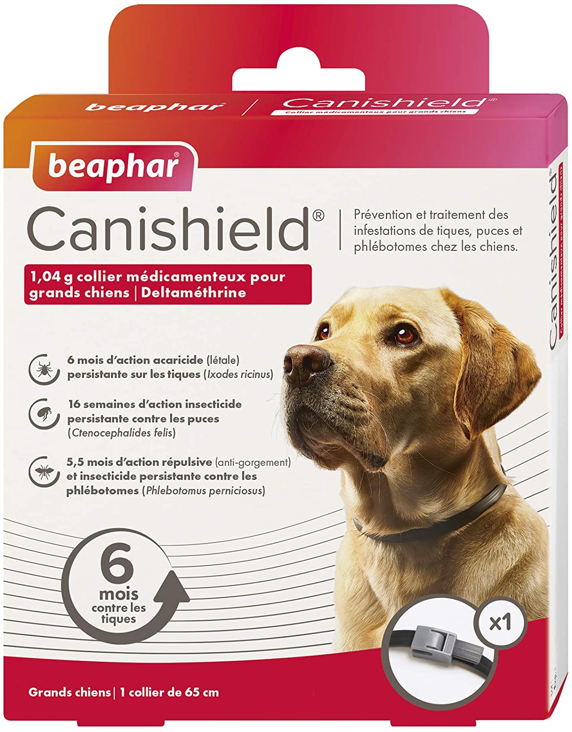 Le collier antiparasitaire Canishield Beaphar protégera votre chien contre les puces, les tiques et les phlébotomes.Protection de 16 semaines contre les puces et 6 mois contre les tiques2 longueurs différentes : 48 ou 65 cm Collier antiparasitaire Canishield Beaphar pour chien Agit efficacement contre les puces, les tiques et les phlébotomes Action persistante contre les puces pendant 16 semaines Action acaricide persistante sur les tiques pendant 6 mois (vecteur de la maladie de Lyme) Action répulsive et insecticide contre les phlébotomes pendant 5,5 mois (vecteur de la Leishmaniose) Le collier est résistant à l'eau (en contact occasionnel) La substance active n'est pas absorbée dans le système sanguin de votre chien Ne pas utiliser avec d'autres antiparasitaires externess Tailles : Petit chien : 48 cm (17207) Grand chien : 65 cm (17210) Médicaments à usage vétérinaire. Usage externe ne pas avaler. Lire attentivement la notice avant utilisation. Demandez conseil à votre vétérinaire ou votre pharmacien. En cas de persistance des symptômes, consultez un vétérinaire. Numéros d'AMM : FR/V/9901386 8/2018 et FR/V/1384386 7/2018.