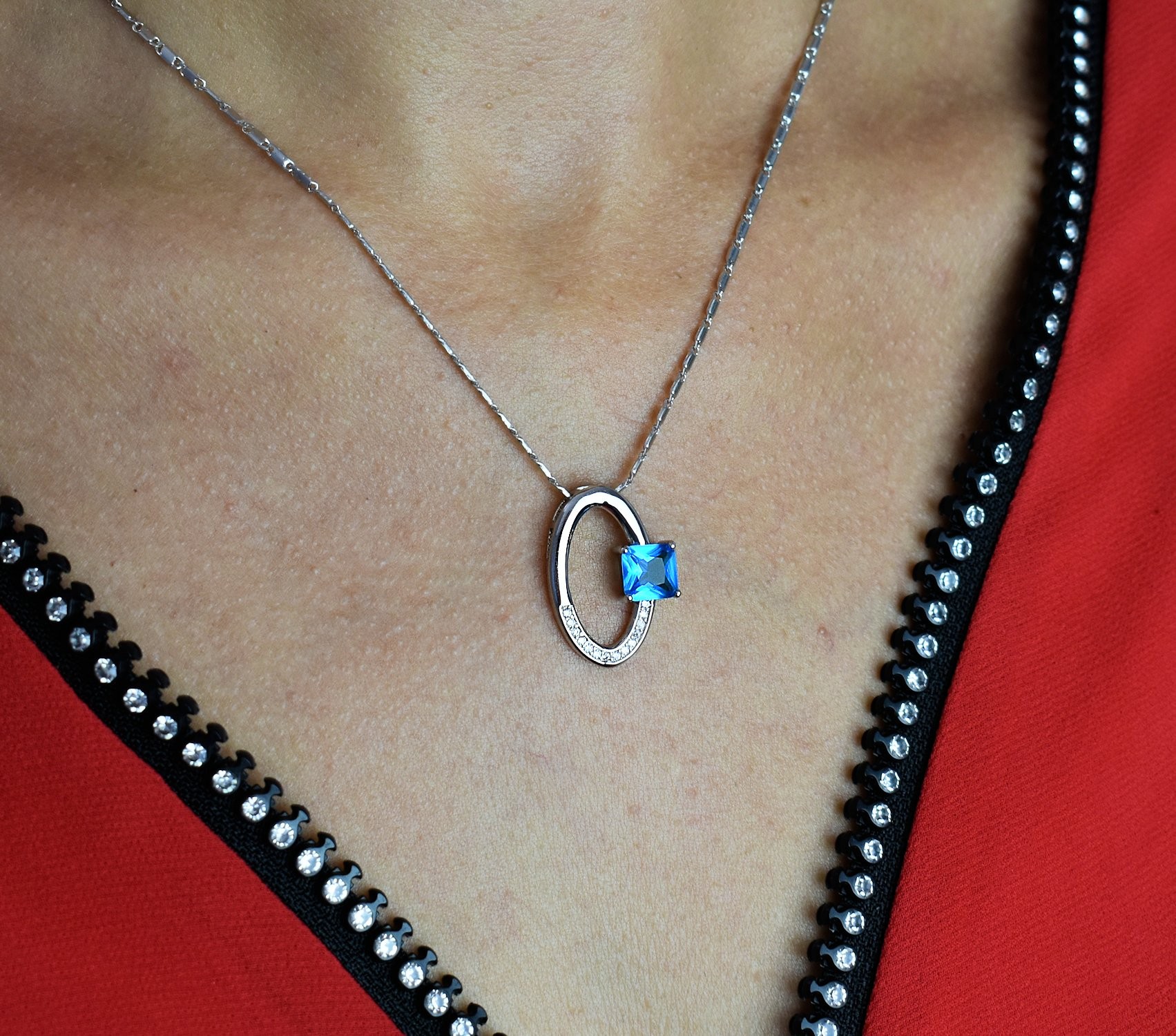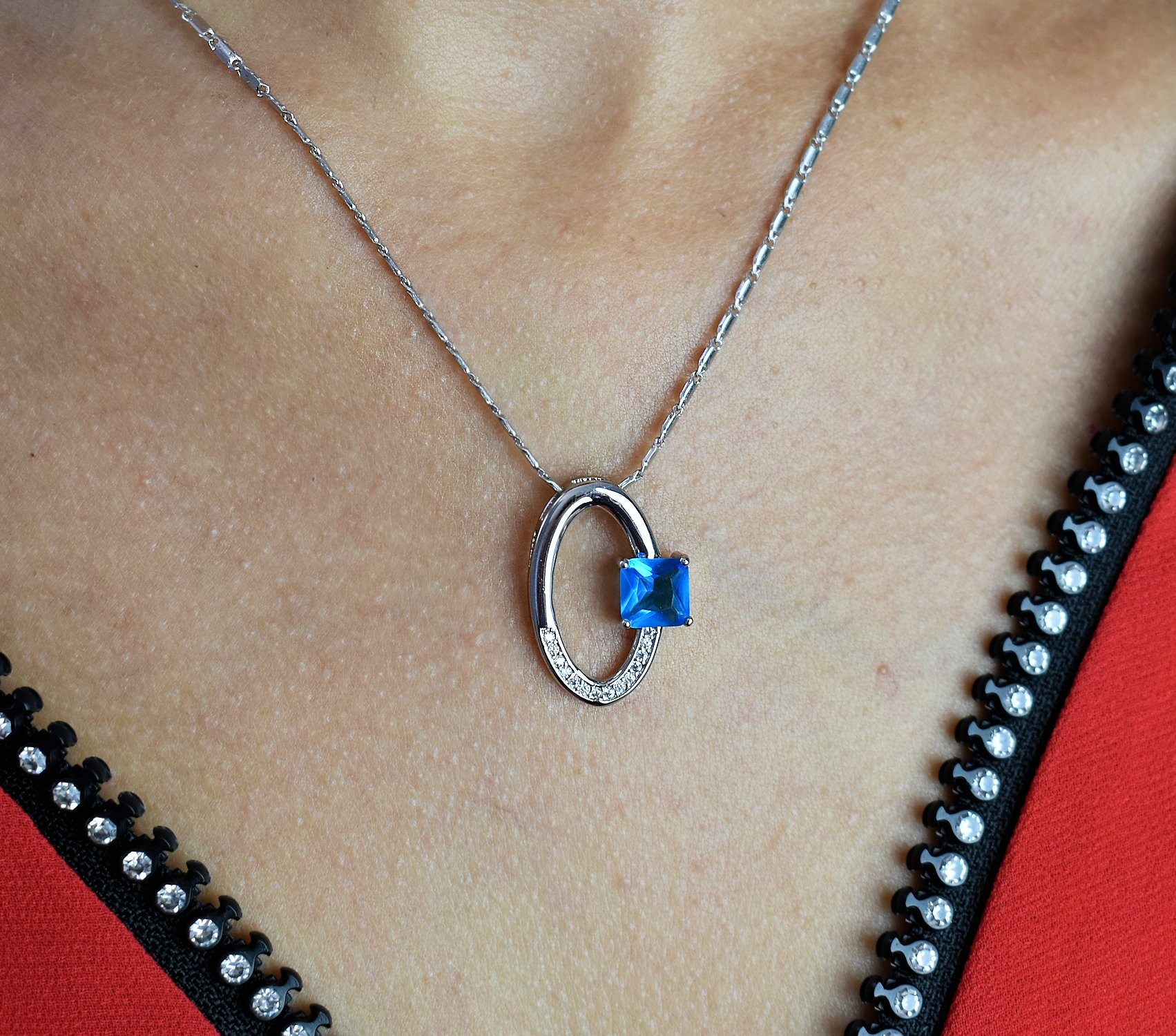 Collier goutte ovale et carré oxyde de zirconium bleu turquoise argenté