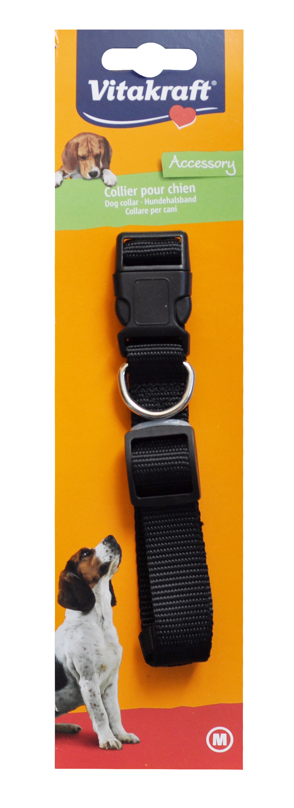Collier premium en nylon doublé noir pour chiens de taille moyenne. M : Basset, Bouledogue, Cocker, Colley, Epagneul Breton et autres épagneuls, Fox Terrier, Griffon Terrier, Lévrier. Ultra confortable. Collier réglable et adaptable à la morphologie de l'animal porteur. Présence d'un anneau pour y relier la laisse. Conseils d'entretien : laver le collier pour chien à l'eau savonneuse sans utiliser de détergent. (tour de cou : 35-45 cm)