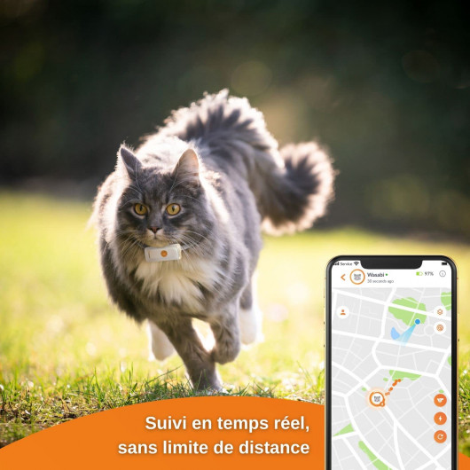 Avec Weenect vous suivez les déplacements de votre chat en temps réel sur une carte, grâce à l'application gratuite. La puce GPS fonctionne sans limite de distance ; votre chat est en sécurité sur tout son territoire.