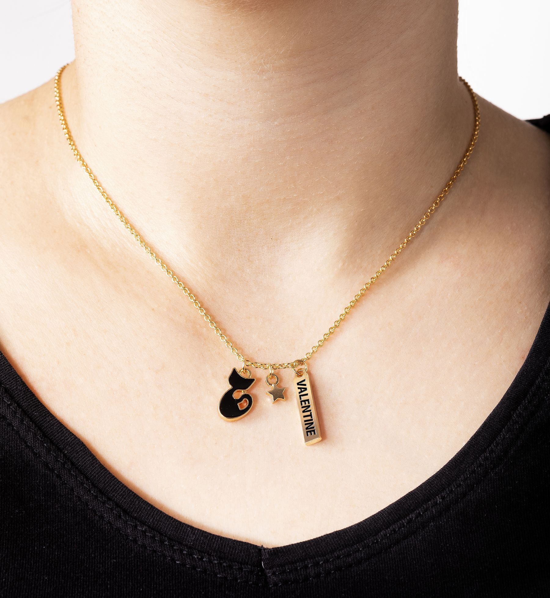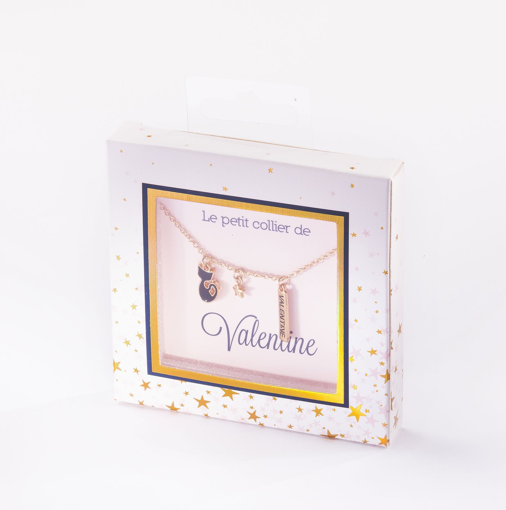 Collier en métal doré garanti sans nickel dans son joli écrin étoilé avec dorure à chaud. Suggestion de présentationUn collier personnalisé avec chams assortis dans sa jolie cartonnette dorée et colorée.