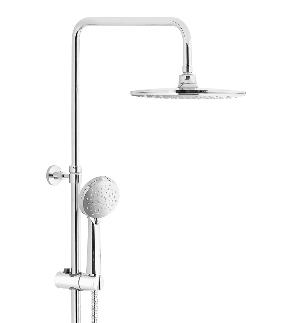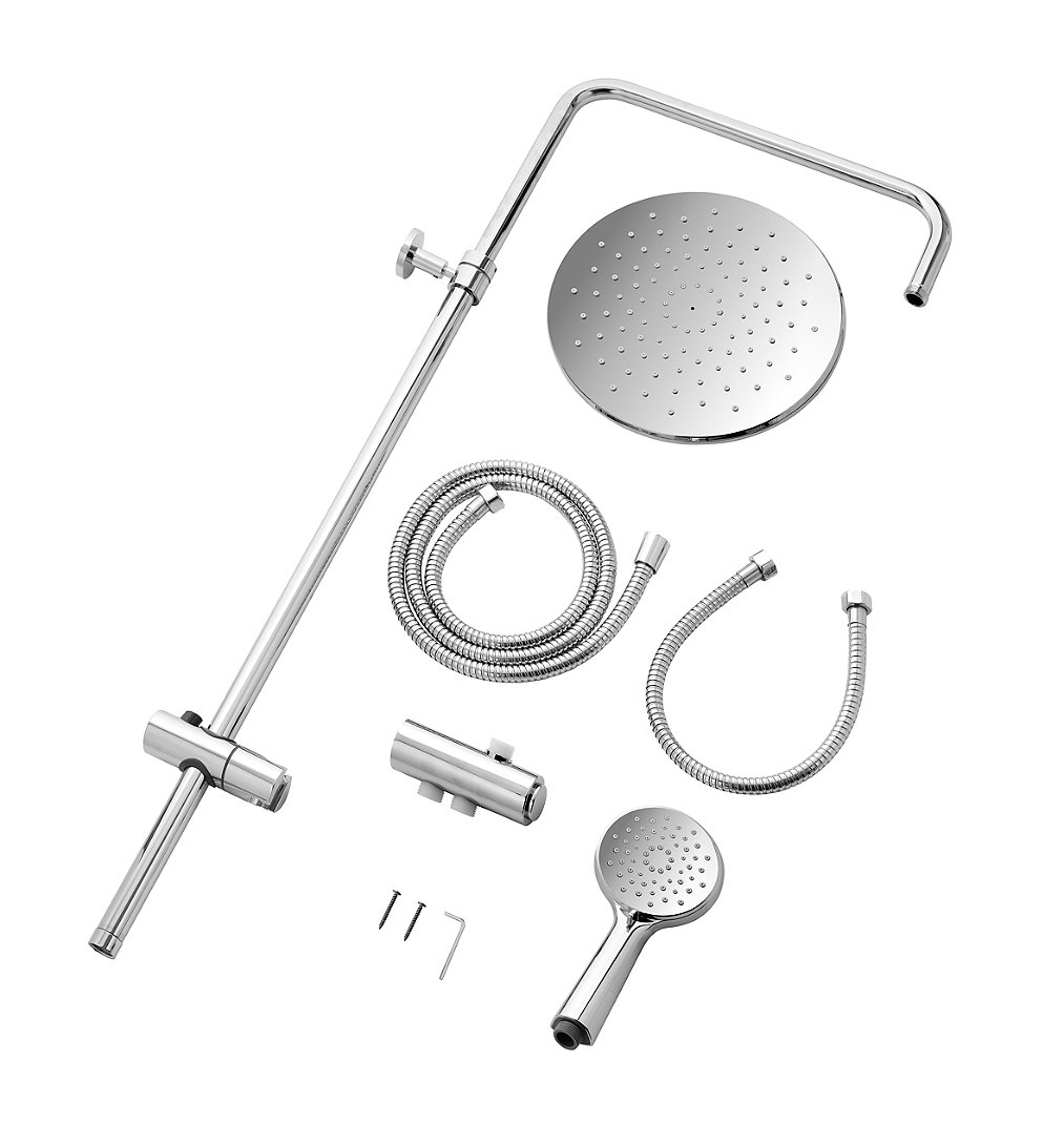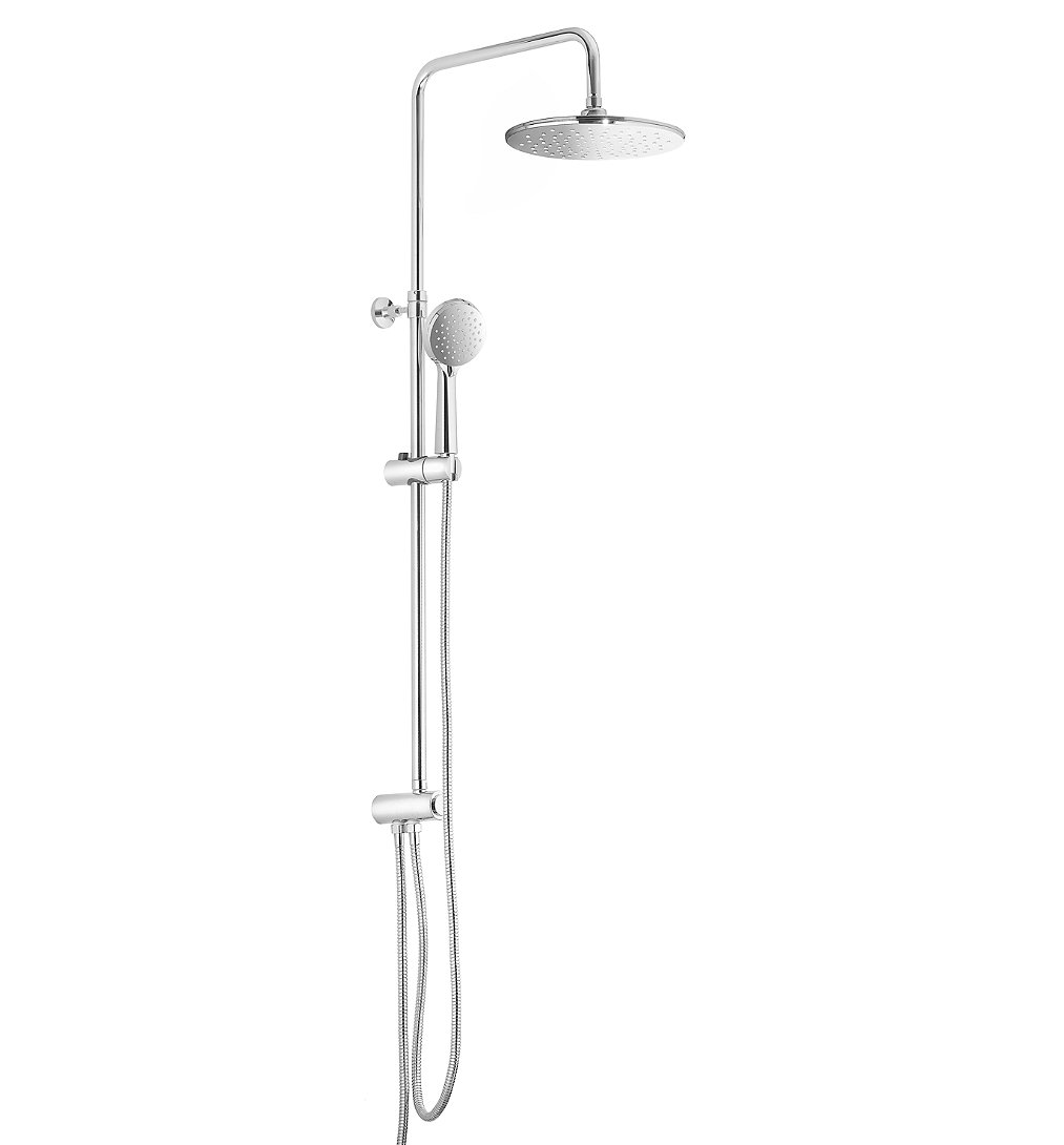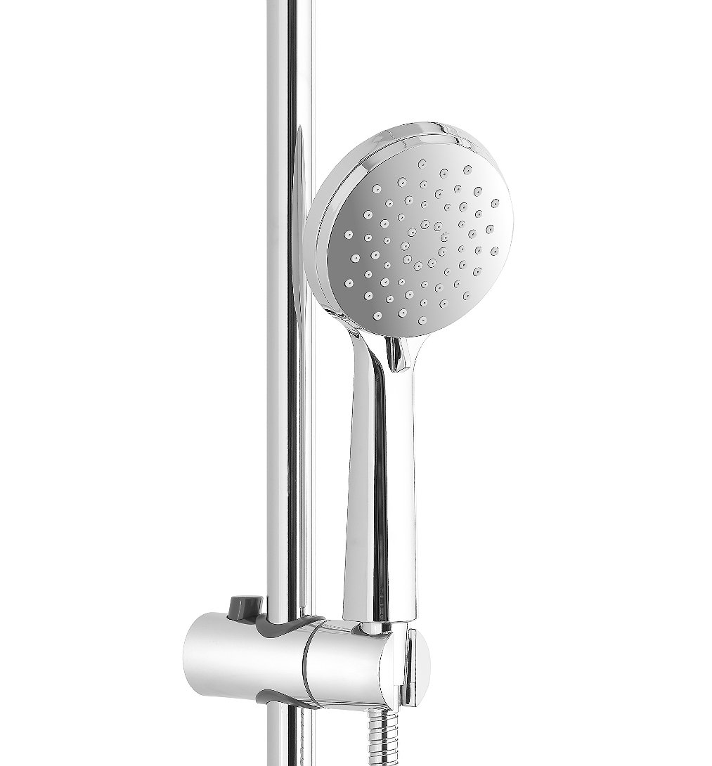 Colonne de douche Chrome - FOXTER Inclus: tête de douche orientable, douchette 3 jet, flexible 1,5m, barre de douche avec patère murale réglable, kit de fixation. Tête de douche et douchette en ABS, flexible et barre de douche en acier inoxydable. Tête de douche: diamètre 25cm. Douchette: diamètre 10cm. Barre de douche ajustable: longueur 80 - 136cm. Jet pluie , Jet massage, Jet mixte. Support douchette réglable en hauteur et orientable. Joint fourni. Entretien facile grâce aux picots anticalcaires.