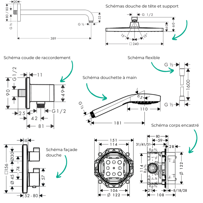 Lot comprenant : Douche de tête, douchette, thermostatique de douche, corps d'encastrement, support de douche, bras de douche, coude de raccordement, flexible de douche