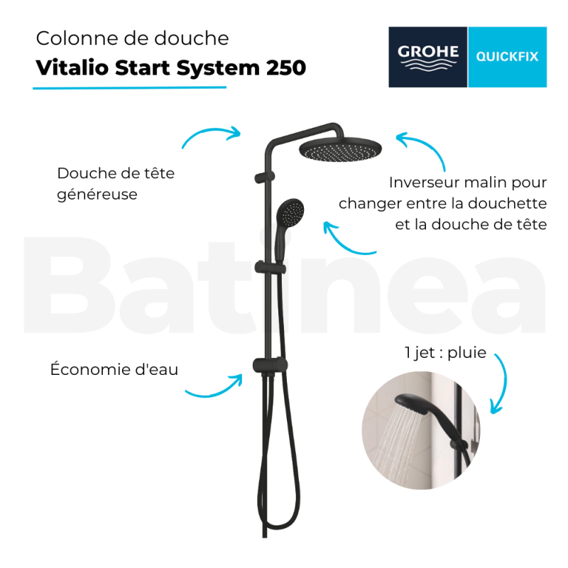 Libellé Colonne de douche GROHE Vitalio Start System 250 avec inverseur noir + Nettoyant GrohClean