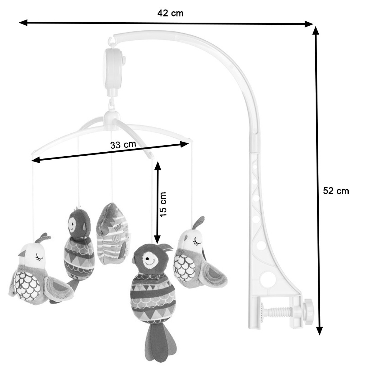 Le mobile COLOR s'adapte à tous les lits bébé grâce à sa fixation universelle. Ce mobile est équipé de 5 peluches amovibles. Boîte musical à remontoir (sans pile). La mélodie dure 4 minutes. Il est possible de l'arrêter grâce à un bouton marche/arrêt. Le remontoir mécanique fait tourner le mobile sur lui-même et diffuse la musique.