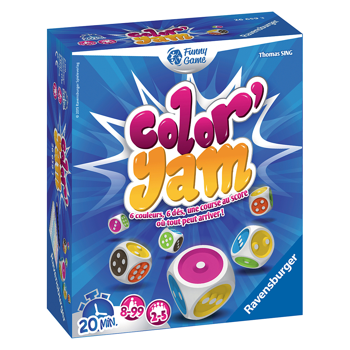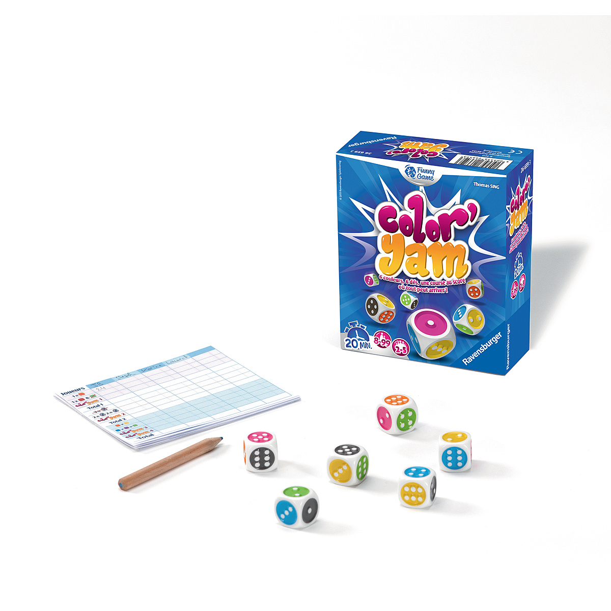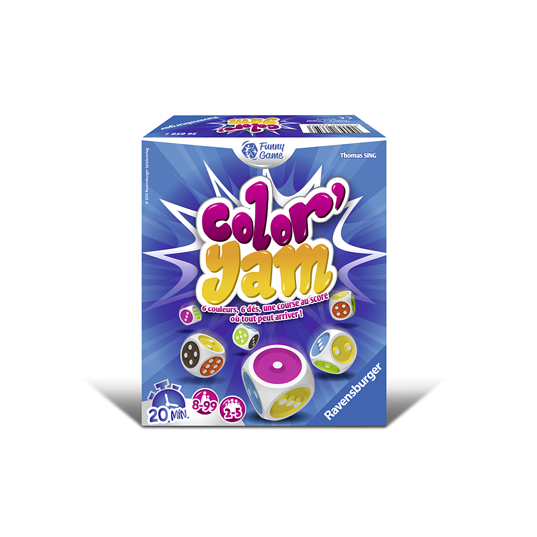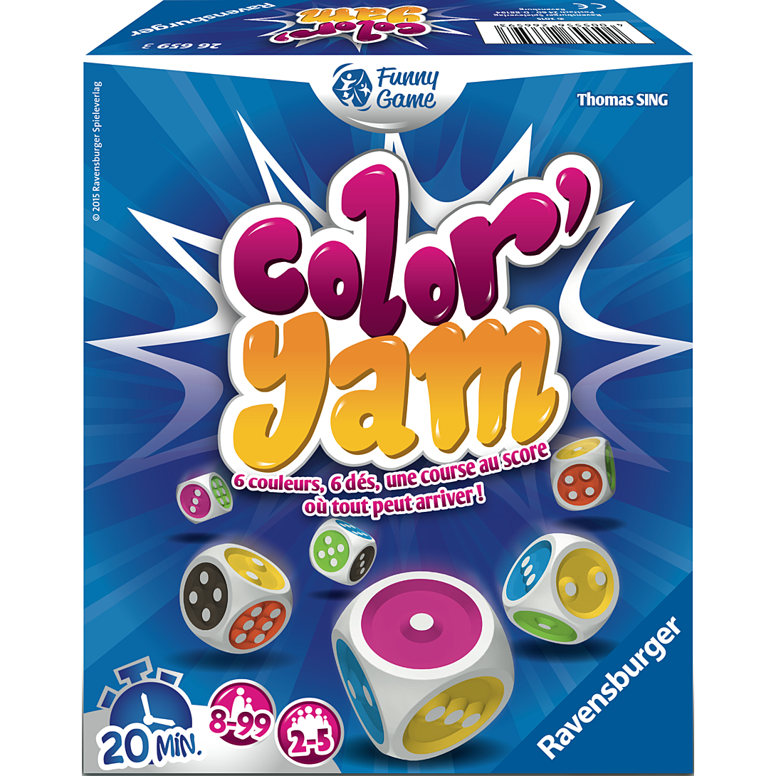 Color'Yam c'est 6 couleurs, 6 dés, une course au score où tout peut arriver ! À chaque tour, marquez un maximum de points pour rafler la meilleure place. Cependant, vous ne pouvez valider vos points qu'à la seule condition d'avoir rempli votre contrat. Un contrat ? Oui : avoir exactement une face rouge, plus de faces bleus que de jaunes, aucune couleur en 3 exemplaires, etc.... Mais attention : vous ne disposez que de 3 lancés ! Tenter d'optimiser son score, c'est prendre le risque d'invalider un contrat réussi... Heureusement les cases Color'Yam sont là pour vous sauver la mise ... pour peu que vous ne soyez pas trop gourmand. Evaluez vos chances et poussez vos adversaires à la faute ! Mais attention, le vent peut vite tourner. Color'Yam, le subtil jeu de dés où la chance se mêle à la tentation.