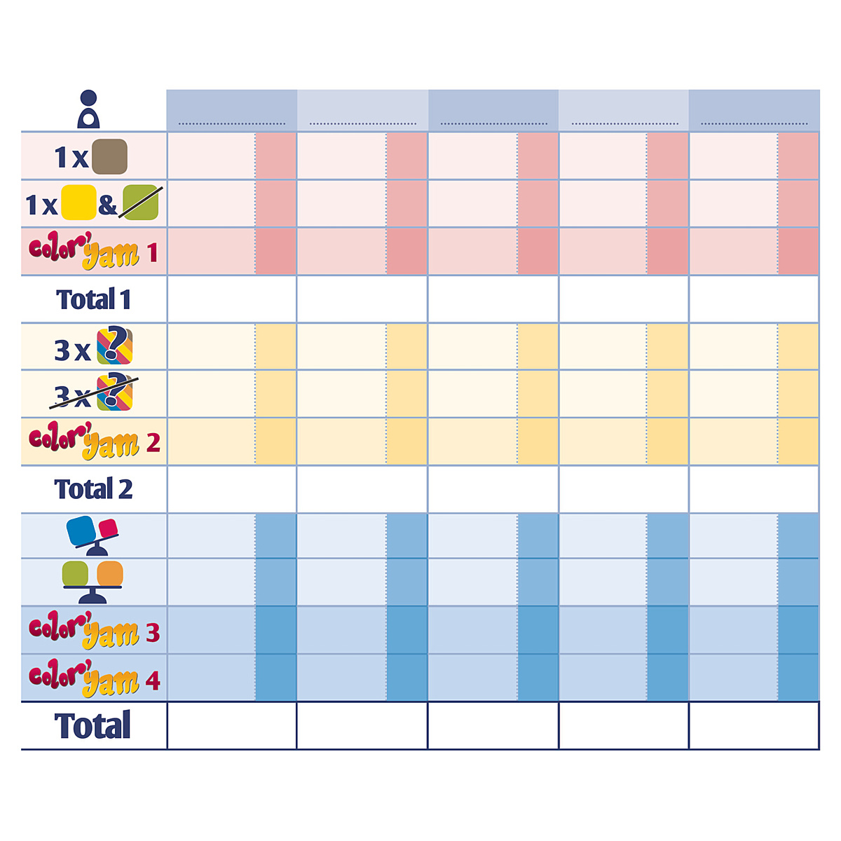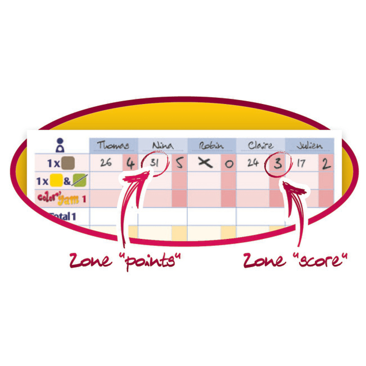 | Plus produit | JEU D\'AMBIANCE : Color\'Yam c\'est 6 couleurs, 6 dés différents et une course au score où tout peut arriver ! Evaluez vos chances et poussez vos adversaires à la faute! Mais attention, le vent peut vite tourner. Un subtil jeu de dés où la chance se mêle à la tentation. DES RÈGLES SIMPLES : A chaque tour, le joueur dispose de 3 lancers pour marquer un maximum de points et rafler la meilleure place. MAIS pour valider vos points vous devez remplir votre objectif. C\'est raté ? Heureusement que les cases Color\'Yam sont là pour vous sauver la mise. Le joueur qui obtient le plus gros score gagne la partie. NIVEAUX ADAPTÉS À TOUS : Pour les débutants, démarrez en douceur avec certaines variantes, soit en choisissant un objectif libre ou les résultats en Color\'Yam n\'ont plus besoin d\'être supérieurs aux précédents. Pour les pros, vous pouvez ajouter plus de tension dans vos parties...atteindre vos derniers Color\'Yam sera plus difficile ! PARTIES COURTES ET DIFFÉRENTES : des parties rapides et différentes à chaque fois, avec une dose de chance et une pointe de stratégie ! Vous recherchez un nouveau jeu de société qui rassemblera petits et grands, avec des règles simples et des parties rapides ? Color\'Yam est le cadeau idéal, petit prix, pour filles et garçons à partir de 8 ans CONTENU : 6 dés colorés, 1 bloc papier et 1 règle du jeu. De 2 à 5 joueurs et à partir de 8 ans. Une partie dure en moyenne 20 minutes. Vous en voulez plus ? Retrouvez nos autres jeux d\'ambiance pour jouer en famille : Paku Paku, Microbz, emoji Twist et même un jeu de cartes Villains ! |