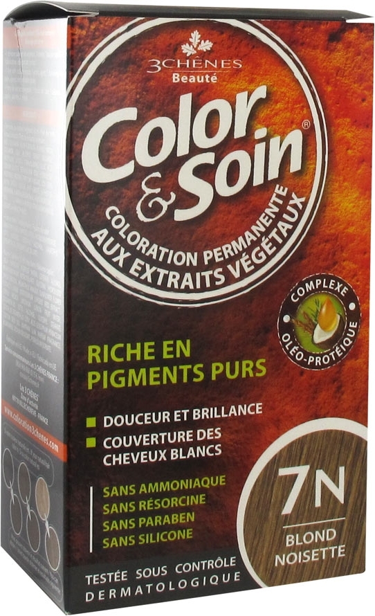 Coloration permanente aux extraits végétaux. Sans ammoniaque, sans résorcine, sans paraben. Color et Soin Coloration Femme des 3 Chênes est une coloration permanente qui couvre 100% des cheveux blancs dès la première application, préserve et prend soin de la chevelure. Testée sous contrôle dermatologique, elle respecte la nature des cheveux, minimisant ainsi les risques d'irritation et d'allergie. De plus, grâce aux protéines végétales et huiles essentielles qu'elle contient, Color & Soin stimule l'éclat, le volume et la souplesse des cheveux. Des pigments colorants sélectionnés permettent d'établir une palette de coloris nuancés qui répondent à toutes les tendances et les envies. 1 étui contient : - un flacon de 60 mL de teinture aux extraits végétaux - un flacon de 60 mL de fixateur - un sachet de 15 mL de baume capillaire - une paire de gants protecteurs - une notice explicative.