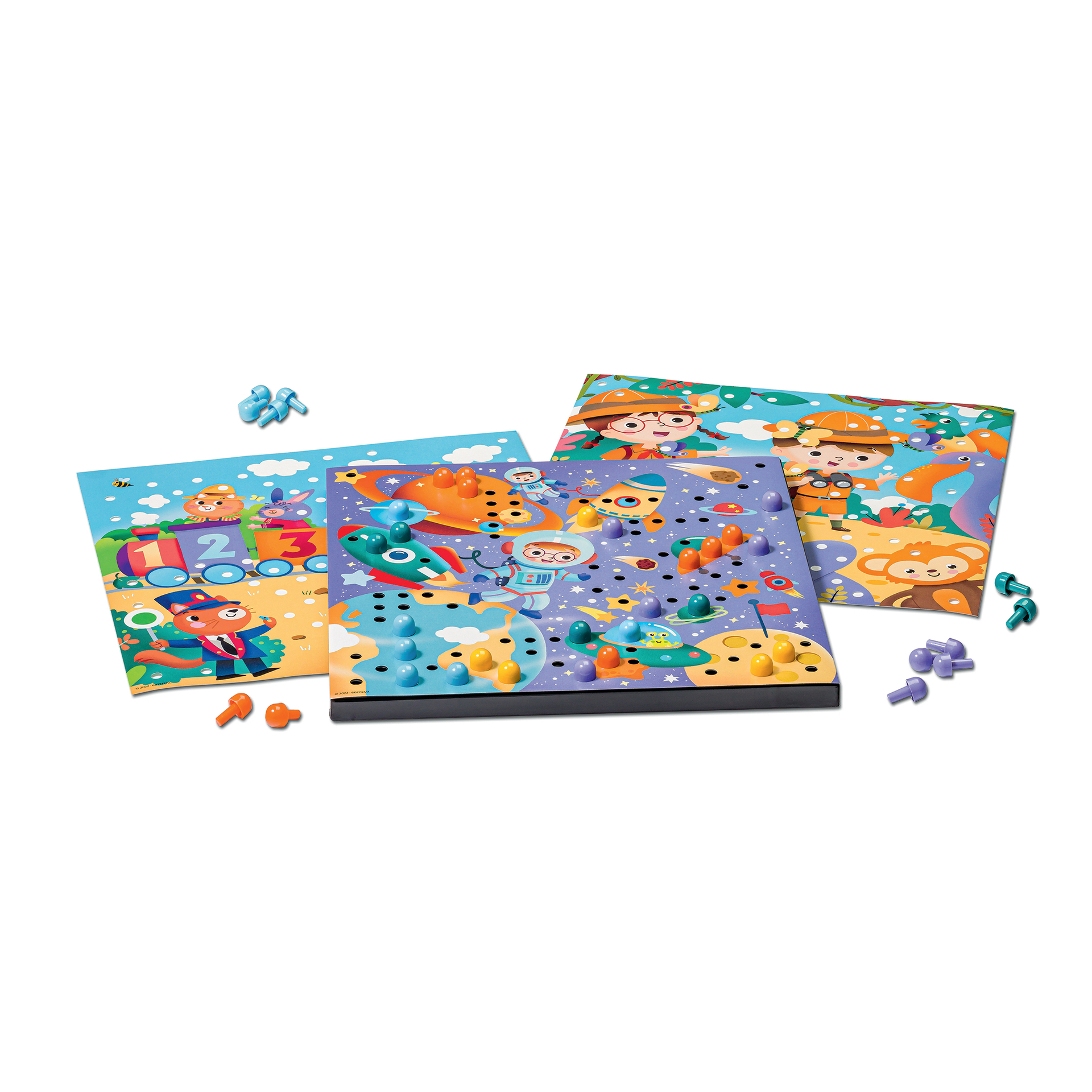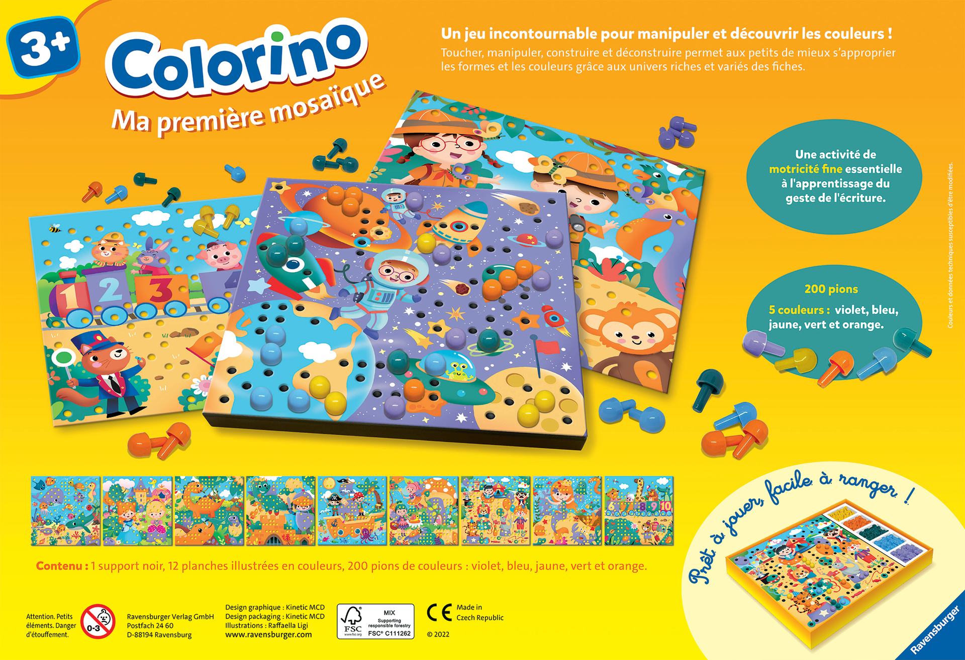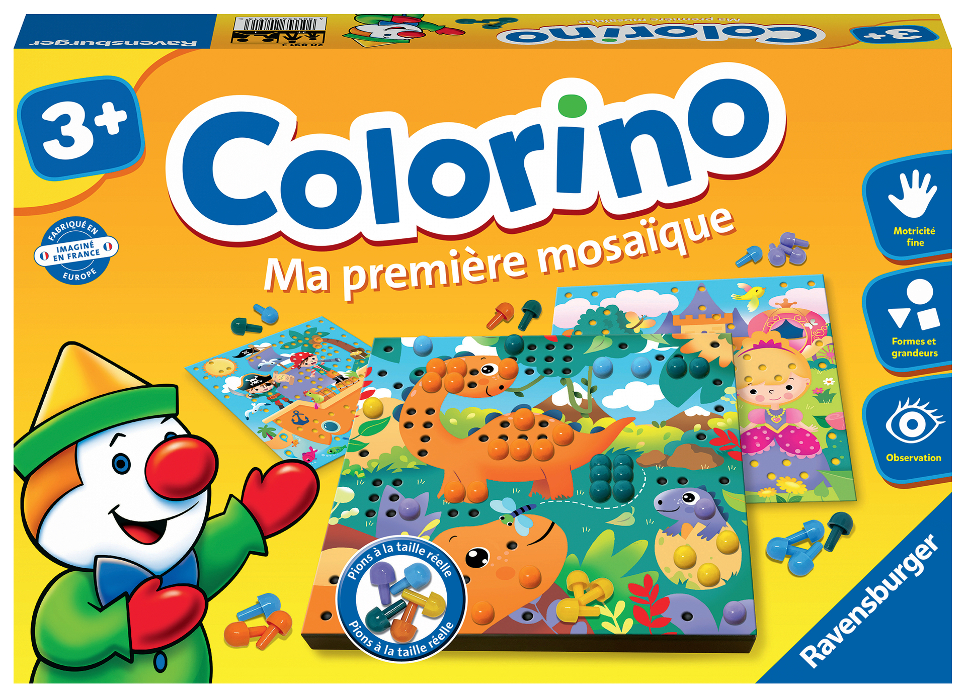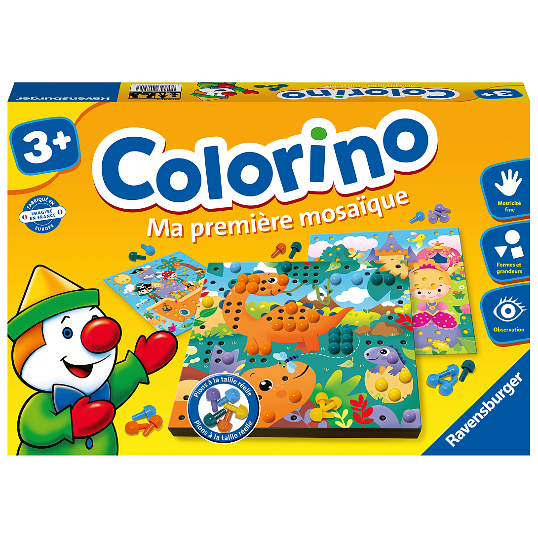 Plus produit Colorino, mon 1er jeu des couleurs ! Toucher, manipuler, construire et déconstruire permet aux petits de mieux s\'approprier les tailles, les formes et les couleurs. Avec ce jeu incontournable, les enfants jouent à compléter des scènes amusantes avec de petits pions colorés, faciles à fixer, sur un support noir. Une activité de motricité fine essentielle à l\'apprentissage du geste de l\'écriture ! Avec Colorino ma première mosaïque, les enfants s\'approprient les formes et les couleurs. Ce jeu favorise le développement de la motricité fine, l\'apprentissage des couleurs qui donnent aux enfants l\'envie de jouer encore et encore. Les enfants vont découvrir 12 fiches sur des thématiques amusantes à compléter. Des univers fantastiques : dans le monde des fées et avec les pirates. Des aventures amusantes pour rejoindre les astronautes en pleine exploration dans l\'espace. Des animaux mignons à rencontrer dans un spectacle au cirque ou en safari ! Contenu : 1 support noir, 12 planches illustrées en couleurs , 200 pions de couleurs : violet, bleu, jaune, vert, orange. Ce produit est composé de matériaux issus de forêts bien gérées certifiées FSC®, de matériaux recyclés et de matériaux issus dautres sources contrôlées (FSC-C111262). Produit imaginé en France et fabriqué en Europe. Ce jeu s\'accompagne d\'une collection entière pour les enfants dès 3 ans. Le coffret \'A,B,C\' pour apprendre l\'alphabet ou le coffret \'formes et couleurs\' pour comprendre les formes, les tailles et les couleurs. Retrouver pour chaque âge de 2 à 5 ans une multitude de jeux basés sur les notions essentielles et sur des connaissances à acquérir.