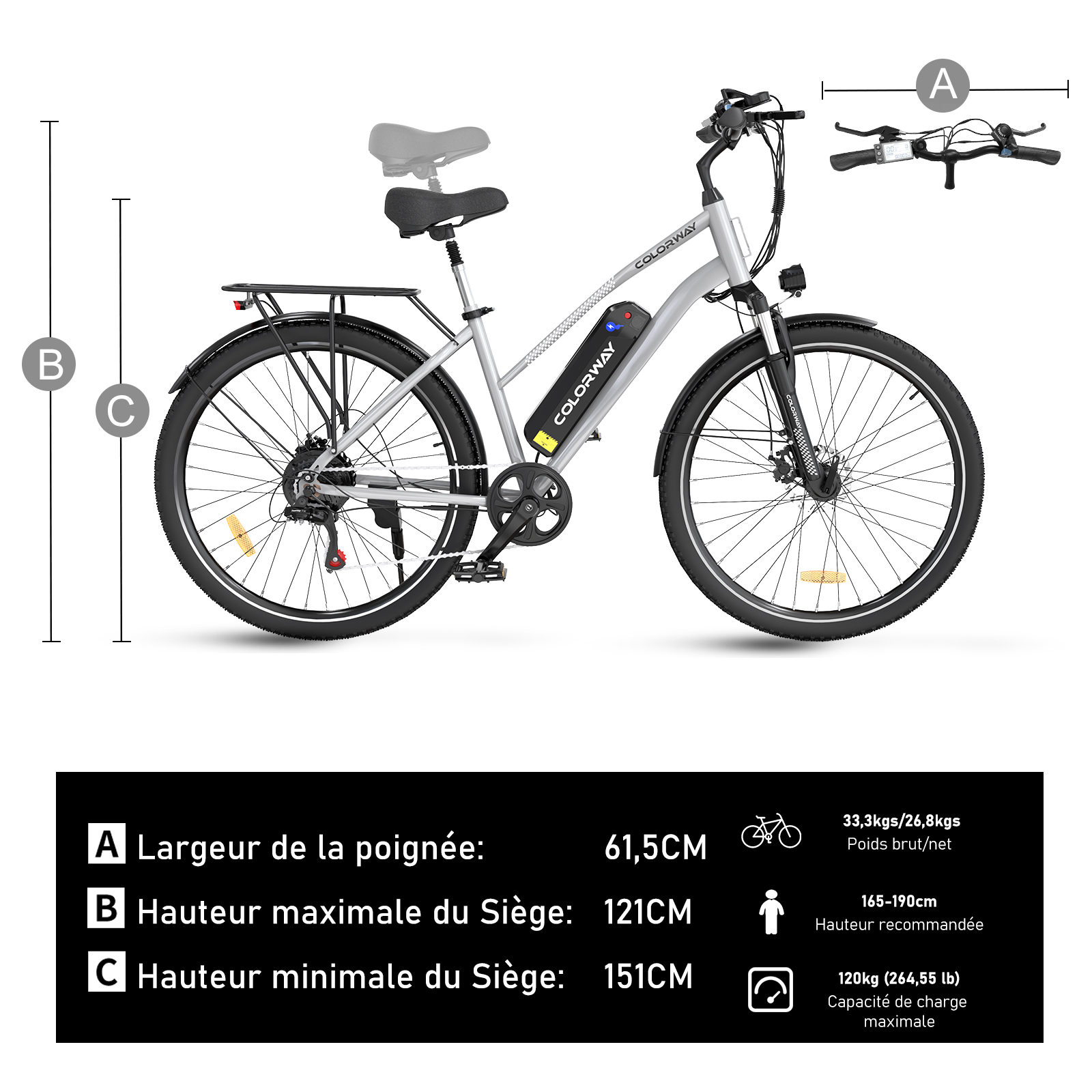 Libellé COLORWAY Vélo Électrique 28" VAE - Batterie amovible 36V 15Ah - Moteur 250W - Shimano 7 Vitesses - E-BIKE VTT Argent