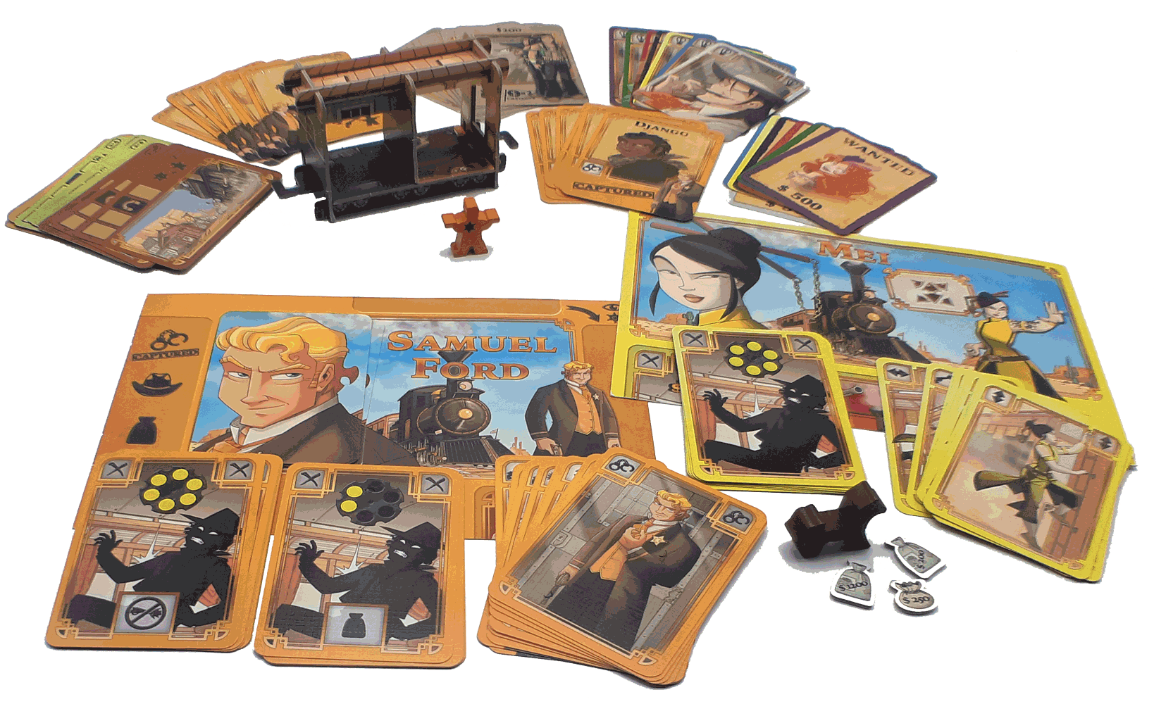 La boîte contient 1 Wagon Prison en 3D, 2 Fiches Personnage, 92 cartes, 1 pion Marshal étoilé, 1 pion Cheval, 3 jetons Butin, 1 règle du jeu.