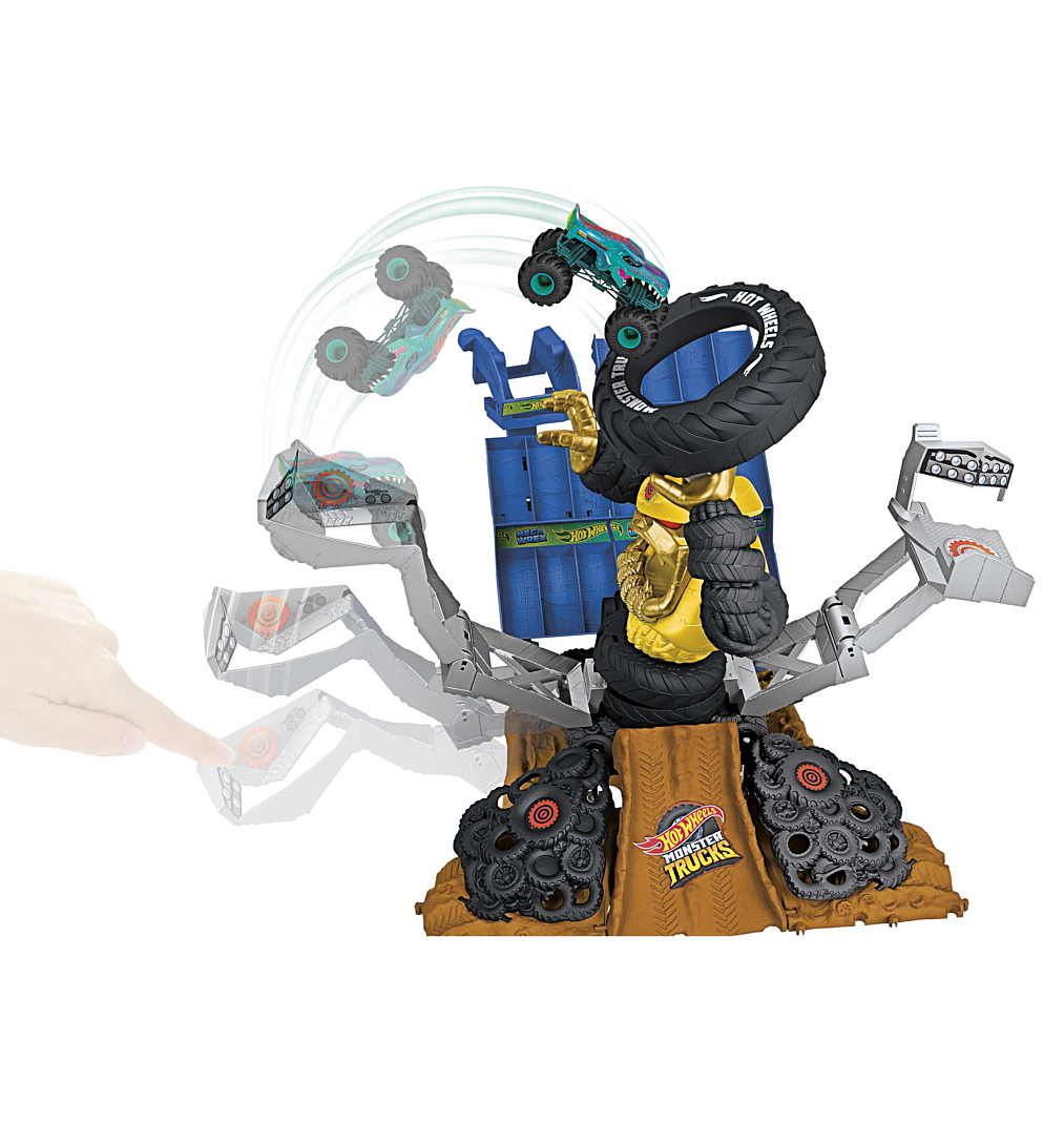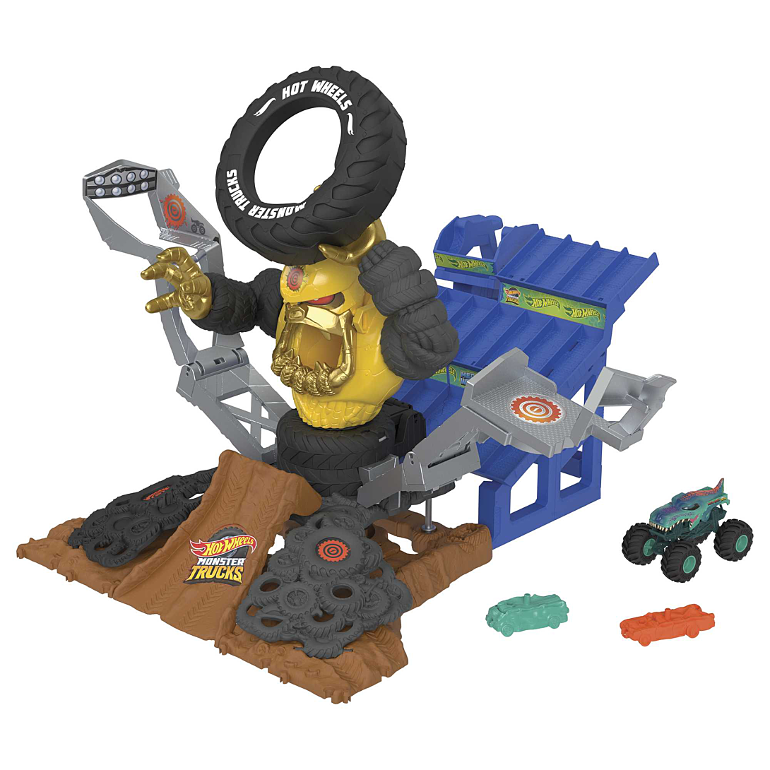 | Plus produit | Avec le coffret Hot Wheels Monster Trucks Arena Smashers Combat Mega-Wrex vs Gorzilla, les enfants font rouler le véhicule Mega-Wrex et le lancent en direction de Gorzilla. La victoire est à eux sils renversent la créature qui tournoie et pivote !\nLa base du coffret bouge et tremble pendant que les enfants jouent, pour une expérience de jeu sensorielle pendant les collisions.\nGorzilla bouge en fonction des attaques du véhicule Mega-Wrex, pour une zone de jeu à 360 degrés et des détails incroyables à explorer.\nLe coffret inclut 1 véhicule Hot Wheels® Monster Trucks Mega-Wrex à léchelle 1/64 et 2 voitures à écraser que les enfants peuvent disposer dans les tribunes ou donner à manger à Gorzilla.\nLes enfants peuvent déposer les voitures à écraser dans la gueule de Gorzilla pour lui donner à manger, puis lancer le véhicule Mega-Wrex au point dimpact approprié pour les libérer. (Autres véhicules vendus séparément.)\nConnectez le coffret Combat Mega-Wrex vs Gorzilla aux autres coffrets Hot Wheels® Monster Trucks Arena Smashers pour construire une arène Monster Trucks aux nombreux défis et obstacles. (Autres coffrets vendus séparément.)\nExcellente idée de cadeau pour les enfants à partir de 4 ans qui adorent imaginer des collisions et des crashs. |