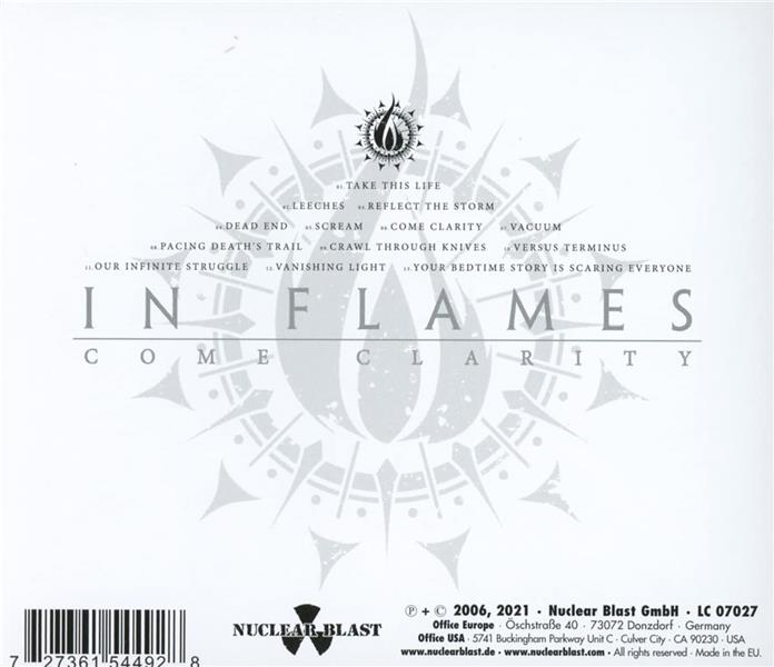 La réédition de 'Come Clarity' d'IN FLAMES sortira sous la forme d'un double LP violet transparent de 180 gr. avec une face D gravée. 2023 a marqué le début d'une nouvelle ère pour IN FLAMES avec la sortie du quatorzième album studio du groupe Foregone - un nouveau chef-d'oeuvre d'un groupe dont la production créative a changé le cours et la direction du metal moderne. Pour poursuivre la tendance ascendante, 2023 marque également la réédition de quatre titres phares du vaste catalogue du groupe, à savoir A Sense of Purpose (2008) (15th Anniversary Edition incluant l'EP The Mirror's Truth qui n'a jamais été disponible en vinyle) , Reroute to Remain (2002), Come Clarity (2006) (plus de 400 000 exemplaires vendus dans le monde + lauréat du prix Grammis suédois du meilleur album de hard rock en 2017) et Sounds of a Playground Fading (2011), tous épuisé et très demandé par les anciens et les nouveaux Jesterheads.