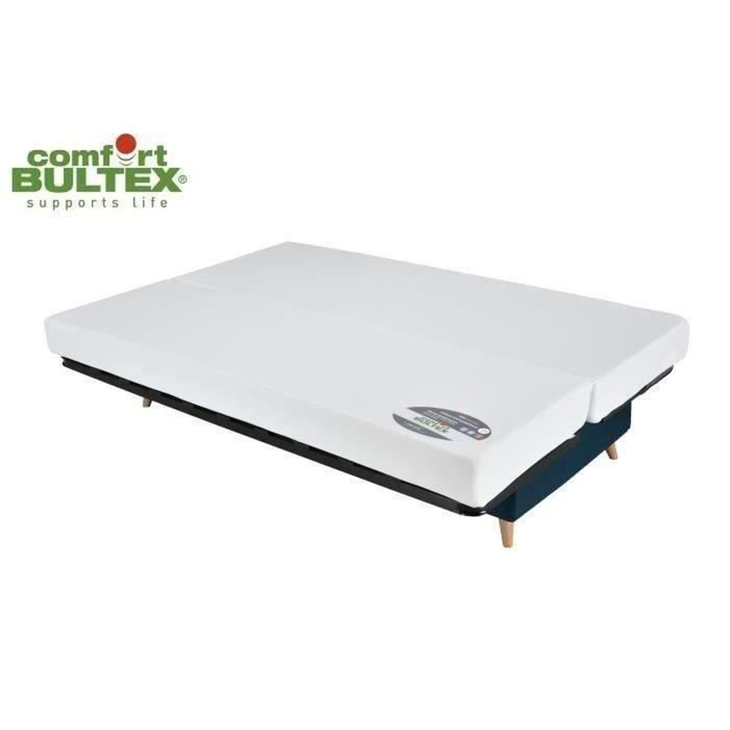 Le canapé clic-clac BULTEX COMFORT est doté d'une structure en laqué époxy noir et de 18 lattes multiplis ton naturel. Son matelas Bi-Bloc Bultex, d'une densité de 32 kg/m3, offre un confort ferme pour un couchage de 130 x 190 cm. Revetu d'un tissu bleu canard foncé 100% polyester, il est accompagné de coussins gris clair A969.