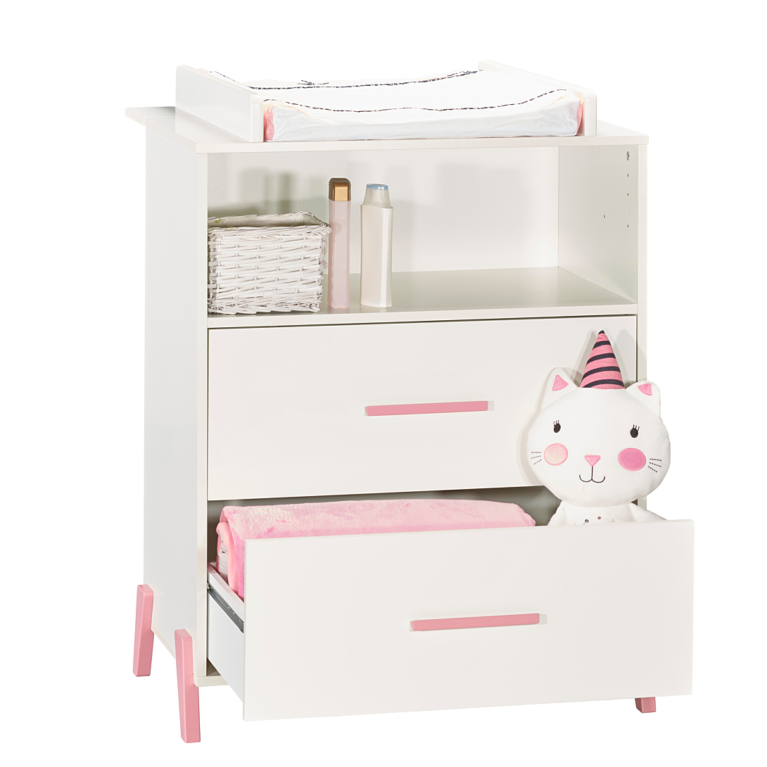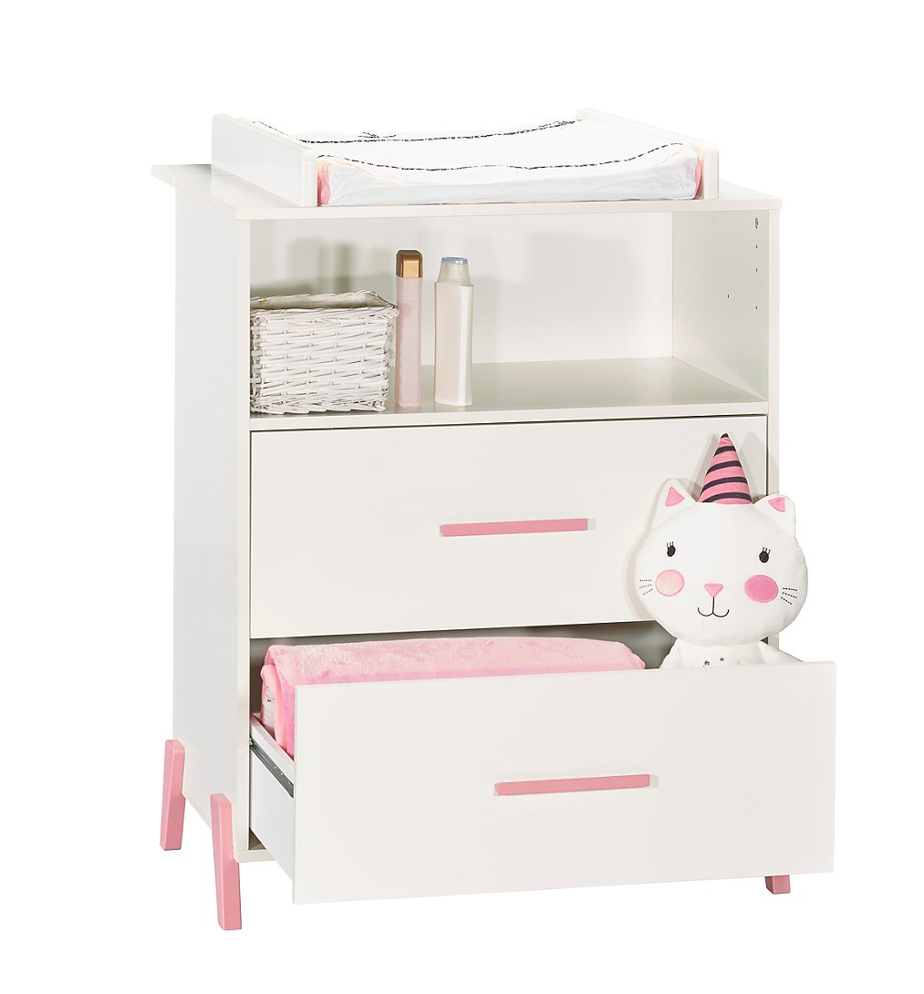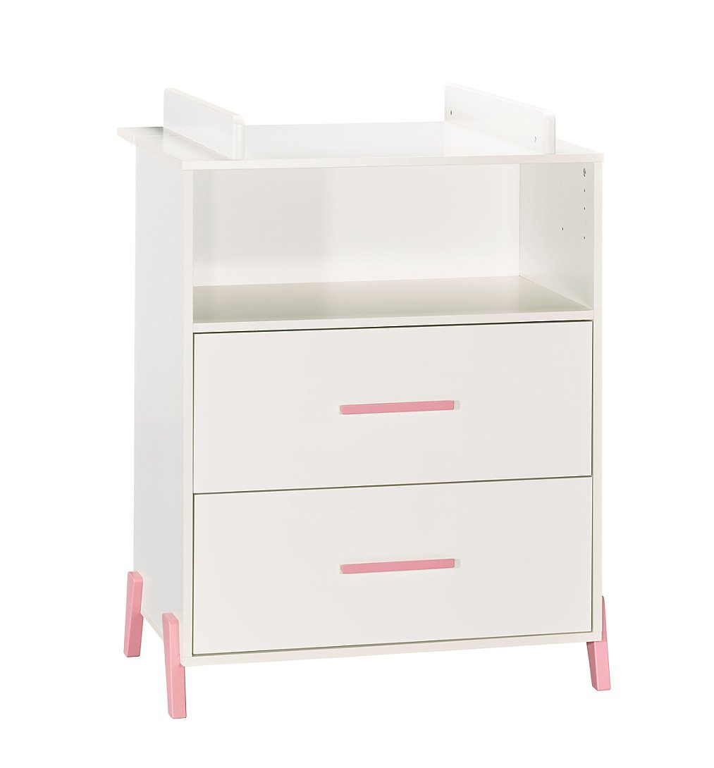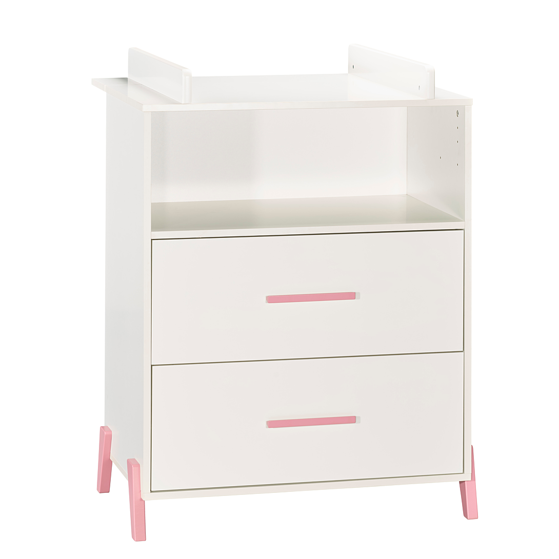 Commode 2 tiroirs et 1 niche pieds roses avec dispositif à langer - JOY ROSE La commode à langer de la collection Joy rose combine modernité et fonctionnalité. Elle possède 2 grands tiroirs et une grande niche pour vous permettre de ranger l'essentiel des affaires de bébé. Vous pourrez ainsi changer bébé en toute sécurité jusqu'à ses 11 kg en ayant l'essentiel à portée de main. Pour une chambre complète, vous pourrez associer à votre commode, les lits 120x60 ou 140x70 et l'armoire 2 portes JOY. Caractéristiques de la commode JOY: Dessus, traverse arrière dispositif à langer, dessous, cotés, tablette niche en panneaux de particules mélaminés décor blanc. Faces tiroirs en panneaux de particules mélaminés décor blanc, chants blancs, et laquées 1 face Blanc. 4 pieds et 2 poignées en hêtre laqués rose poudré. 2 joues du dispositif à langer en panneaux de fibres de moyenne densité (MDF) laquées blanc. Fabrication française Garanti sans solvant Conforme aux normes de sécurité en vigueur Afin d'utiliser la commode en toute sécurité, elle doit être fixée au mur; sangle fournie. Le dispositif à langer est utilisable jusqu'aux 11 kg de l'enfant. Dimensions de la commode JOY: 76 x 103 x 66cm Dimensions utiles dispositif à langer: 68x52cm