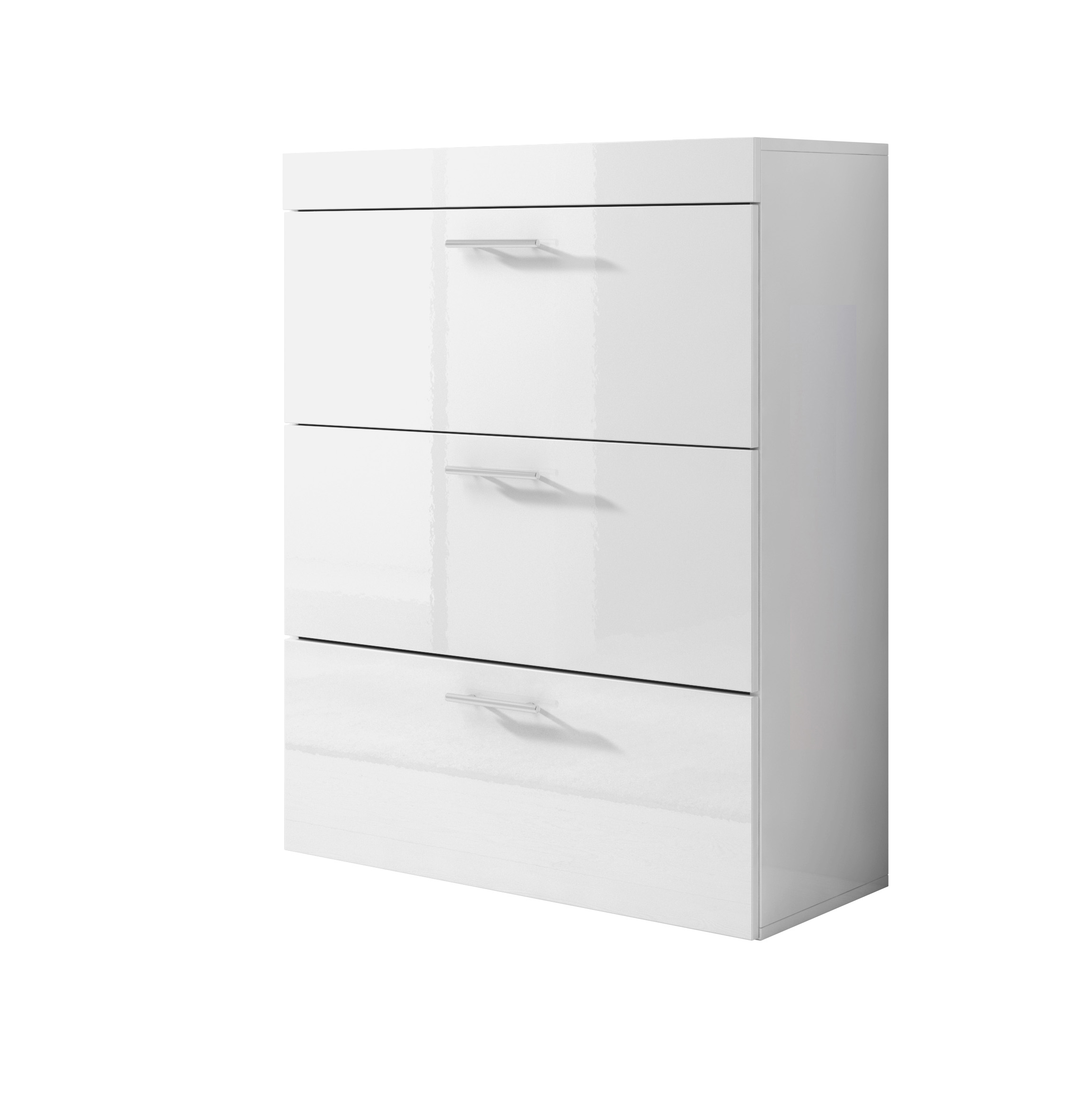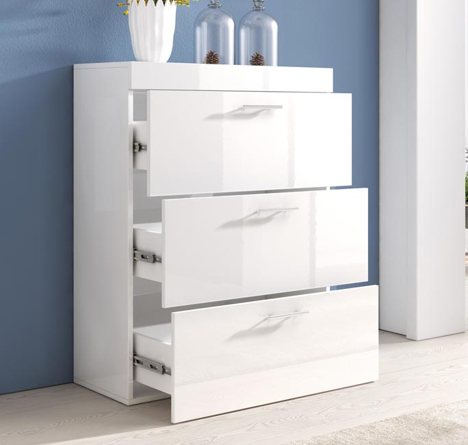 Commode 3 tiroirs | 75 x 99 x 36 cm | Blanc Finition brillante | Poignées Aluminium | Meuble de rangement