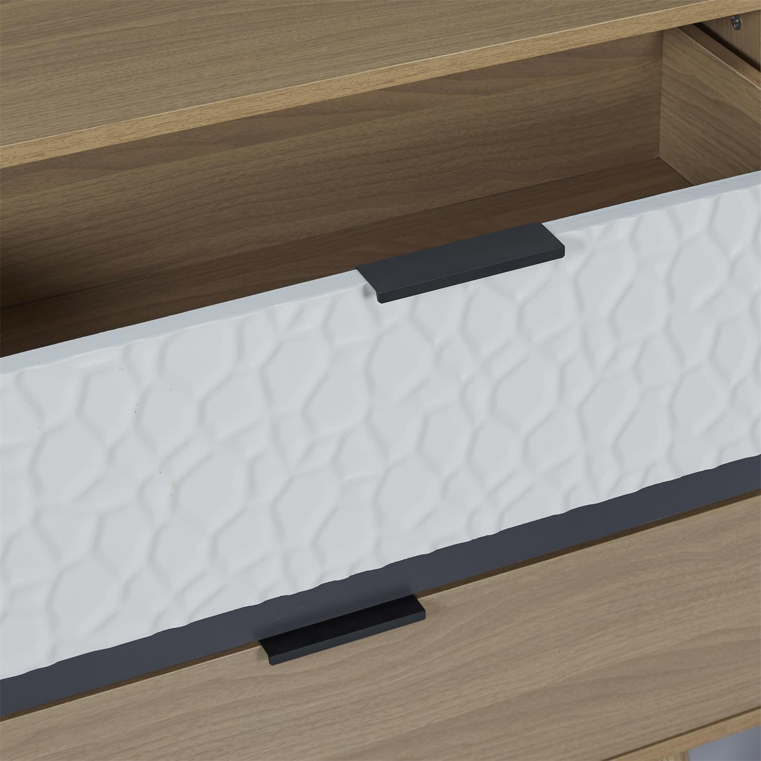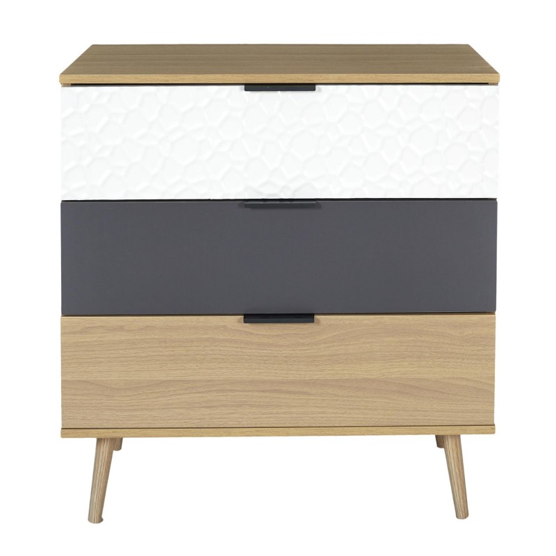 Optez pour le style scandinave de cette commode 3 tiroirs modèle Sven. Le style matière avec ses différentes textures de tiroirs apportera toute l'originalité de ce meuble. A monter soi même. Dimensions : L75 x l39 x H80 cm. Poids : 27 kg. Matière : Panneaux de particules MDF. Marque : Home Déco Factory.