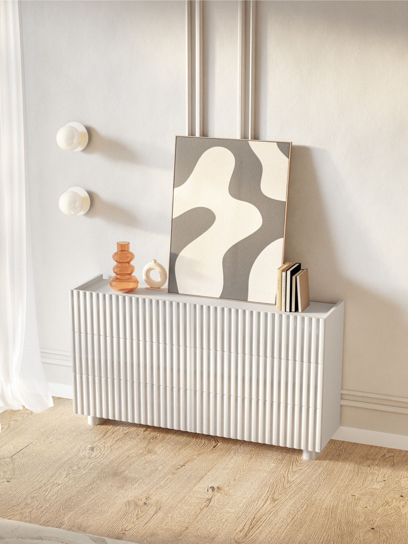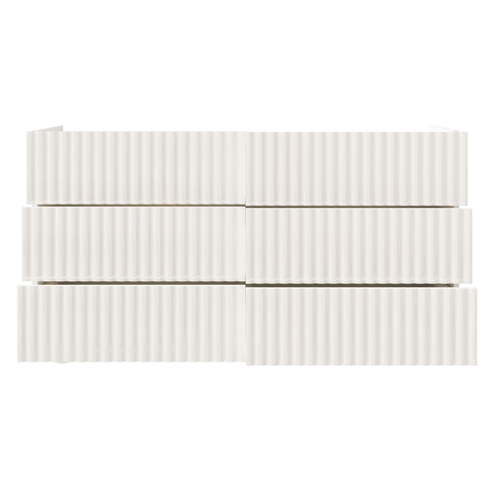 Les façades rainurées, délicatement arrondies et la teinte blanche subtile font de cette commode un élément décoratif élégant qui s’intègre harmonieusement dans différents espaces de vie. Fabriquée en panneau de particules stratifié résistant et façades MDF robustes, la commode est durable, facile à entretenir et idéale pour un usage quotidien.