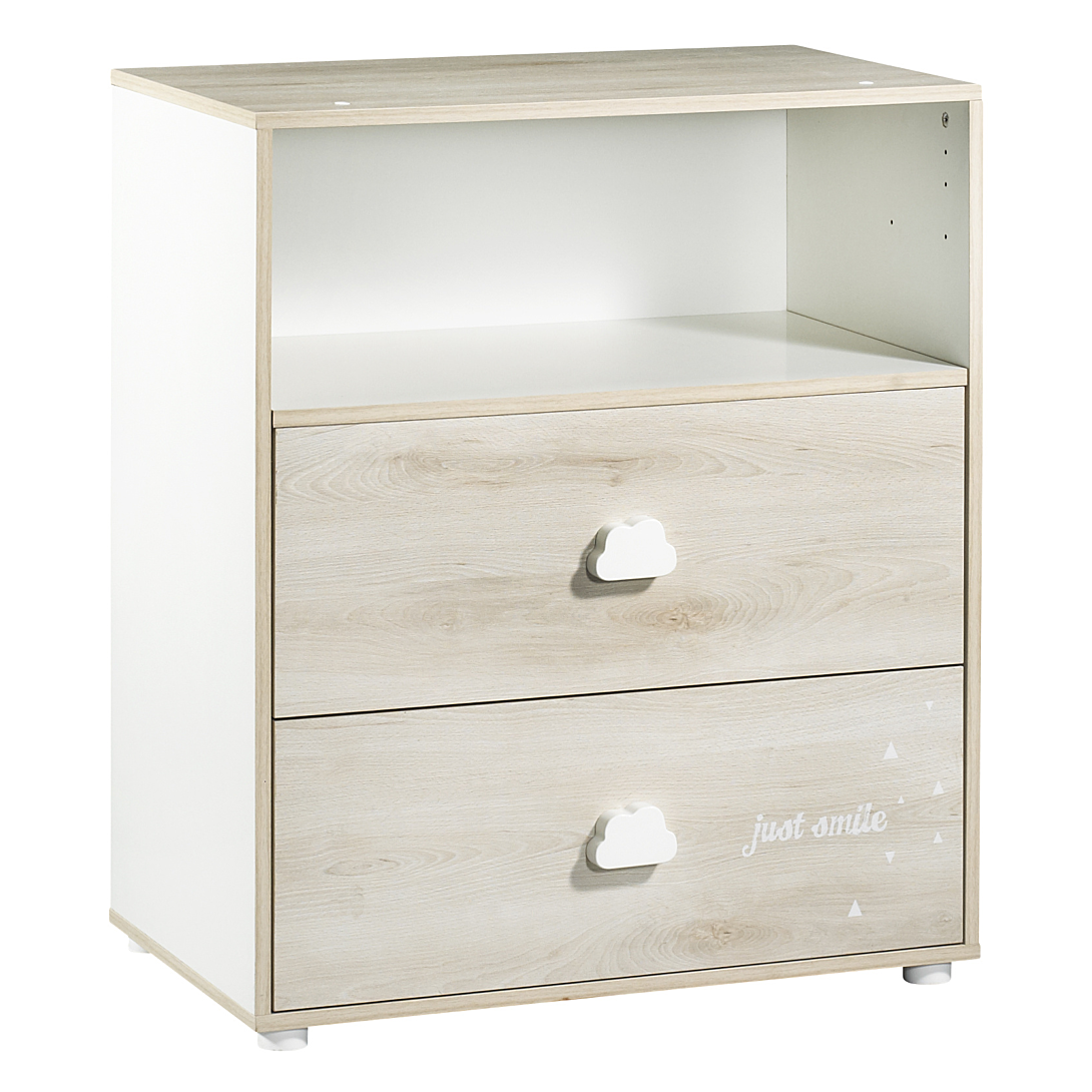 Commode 2 tiroirs 1 niche avec dispositif à langer (amovible) inclus - Hêtre Cendré - Collection Smile - Une collection mixte aux tons Hêtre cendré et blanc. Boutons "nuage" laqués blanc et décor "Just Smile" par sérigraphie, pour que bébé s'endorme en toute sérénité ! - Aménagement intérieur : 2 tablettes (une fixe et une mobile), boutons "nuage" blancs. - Idéal pour ranger les affaires de bébé. - Assortie aux lits SM031, SM111 et à l'armoire 2 portes référence SM191. - Garantie sans solvant. Panneaux garantis avec une teneur en formaldéhydes 8 mg. - Fabrication française. - Meuble à monter soi-même. - Afin d'utiliser la commode en toute sécurité, elle doit être fixée au mur (sangle fournie). Dimensions: L 76 x H 97 x P 66