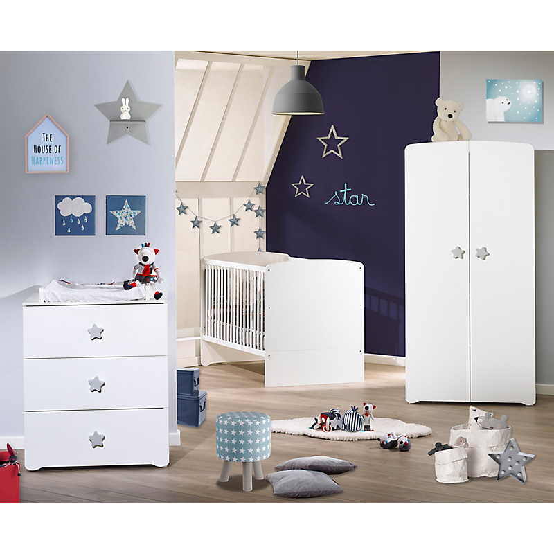 Commode 3 tiroirs avec dispositif à langer (amovible) inclus - Laquée Blanc et Boutons Etoiles Gris - Collection Basic - Une collection mixte essentielle pour l'arrivée de bébé, laquée blanc et agrémentée de boutons "étoile" gris fumé. - Idéal pour ranger les affaires de bébé. - Assortie aux lits 1P032, 1P035, 1P037 & 1P113 et à l'armoire 2 portes référence 1P194. - Garantie sans solvant. Panneaux garantis avec une teneur en formaldéhydes <=8 mg. - Fabrication française. Conforme à la norme NF EN 12221 n°1 & 2 (2008)+ A1 octobre 2013 Dimensions: L 76 x l 66 H 97 Composition: Panneau de particules mélaminé blanc / Panneau de fibres de moyenne densité (MDF) laqué blanc / Panneau de fibres dures blanc. Boutons "étoile" gris fumé en MDF. Conseils d'entretien Dépoussiérage chiffon sec : ni alcool, ni solvant. Tâches rebelles : éponge légèrement humide. Meuble à monter soi-même