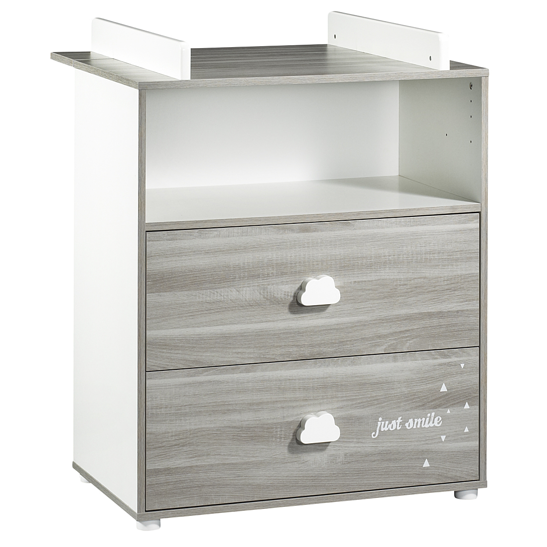 Commode 2 tiroirs 1 niche avec dispositif à langer (amovible) inclus - Hêtre Cendré - Collection Smile - Une collection mixte aux tons Hêtre cendré et blanc. Boutons "nuage" laqués blanc et décor "Just Smile" par sérigraphie, pour que bébé s'endorme en toute sérénité ! - Aménagement intérieur : 2 tablettes (une fixe et une mobile), Boutons "nuage" blancs. - Idéal pour ranger les affaires de bébé. - Assortie aux lits SM031, SM111 et à l'armoire 2 portes référence SM191. - Garantie sans solvant. Panneaux garantis avec une teneur en formaldéhydes 8 mg. - Fabrication française. - Meuble à monter soi-même. - Afin d'utiliser la commode en toute sécurité, elle doit être fixée au mur (sangle fournie). Dimensions: L 76 x H 97 x P 66