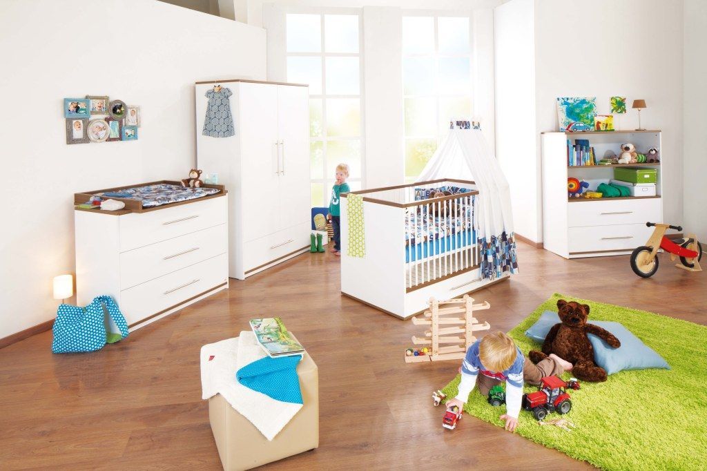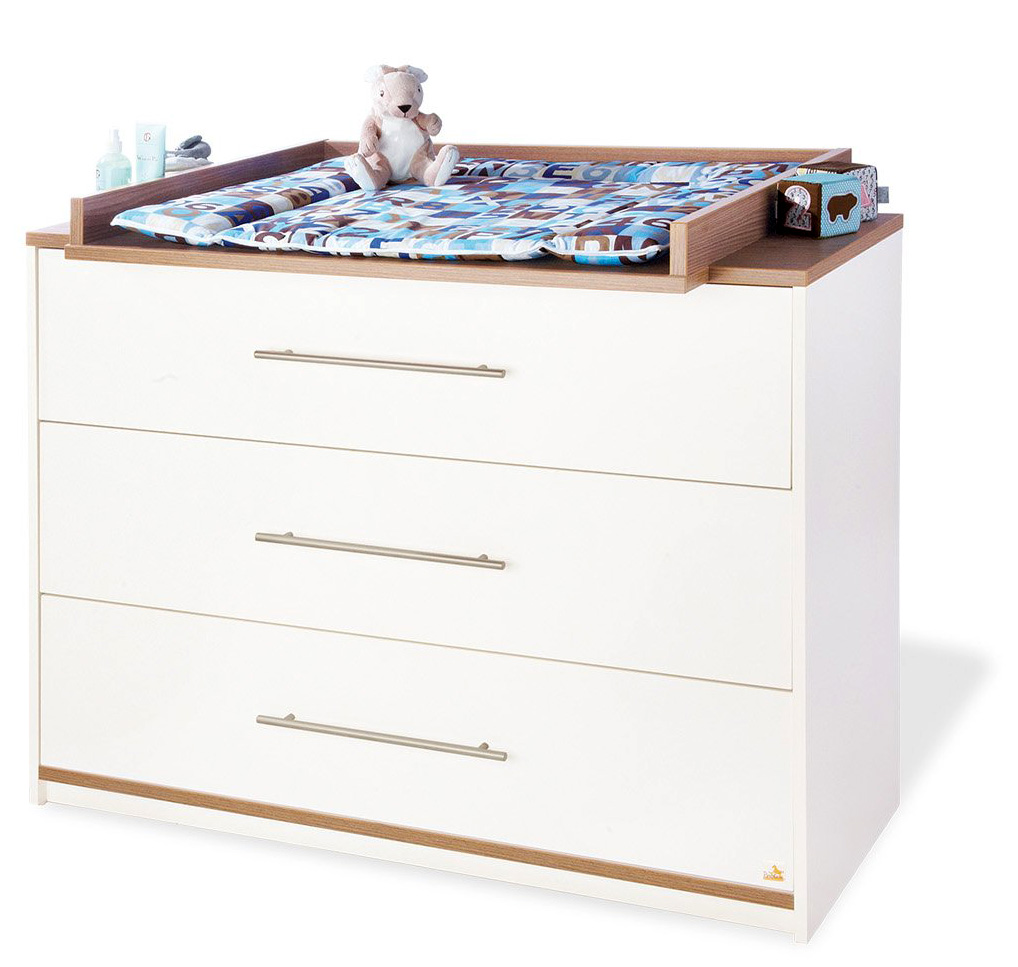 Qualité Pinolino de haute qualité; Matériel: Décor blanc avec des accents en noyer avec structure en bois véritable; Dimensions: L 115 cm, T 76 ou 47 cm, H 96 cm (hauteur d'emballage 90 cm); La livraison comprend une large table à langer, installation requise (matelas non inclus)
