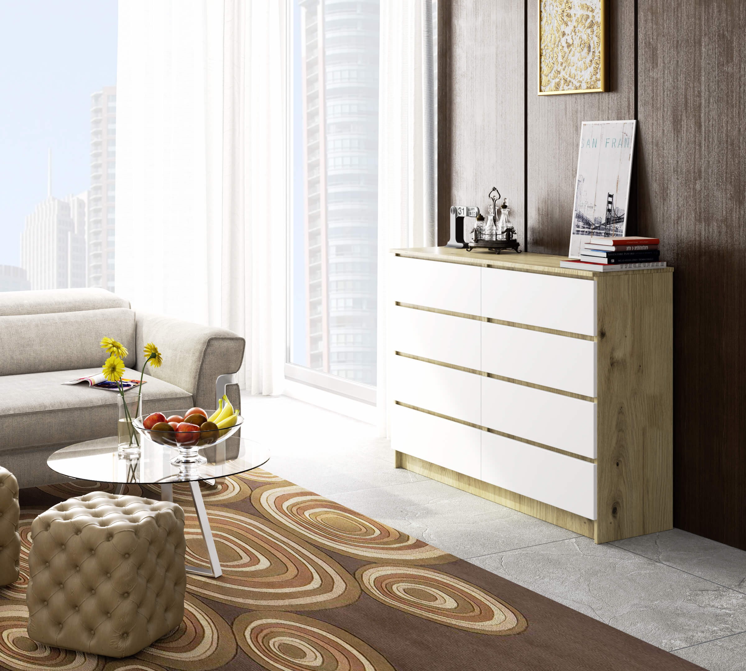 Commode AKORD K140 Chêne Artisan 138 cm 8 tiroirs façade Blanche 138x40x99 cm
