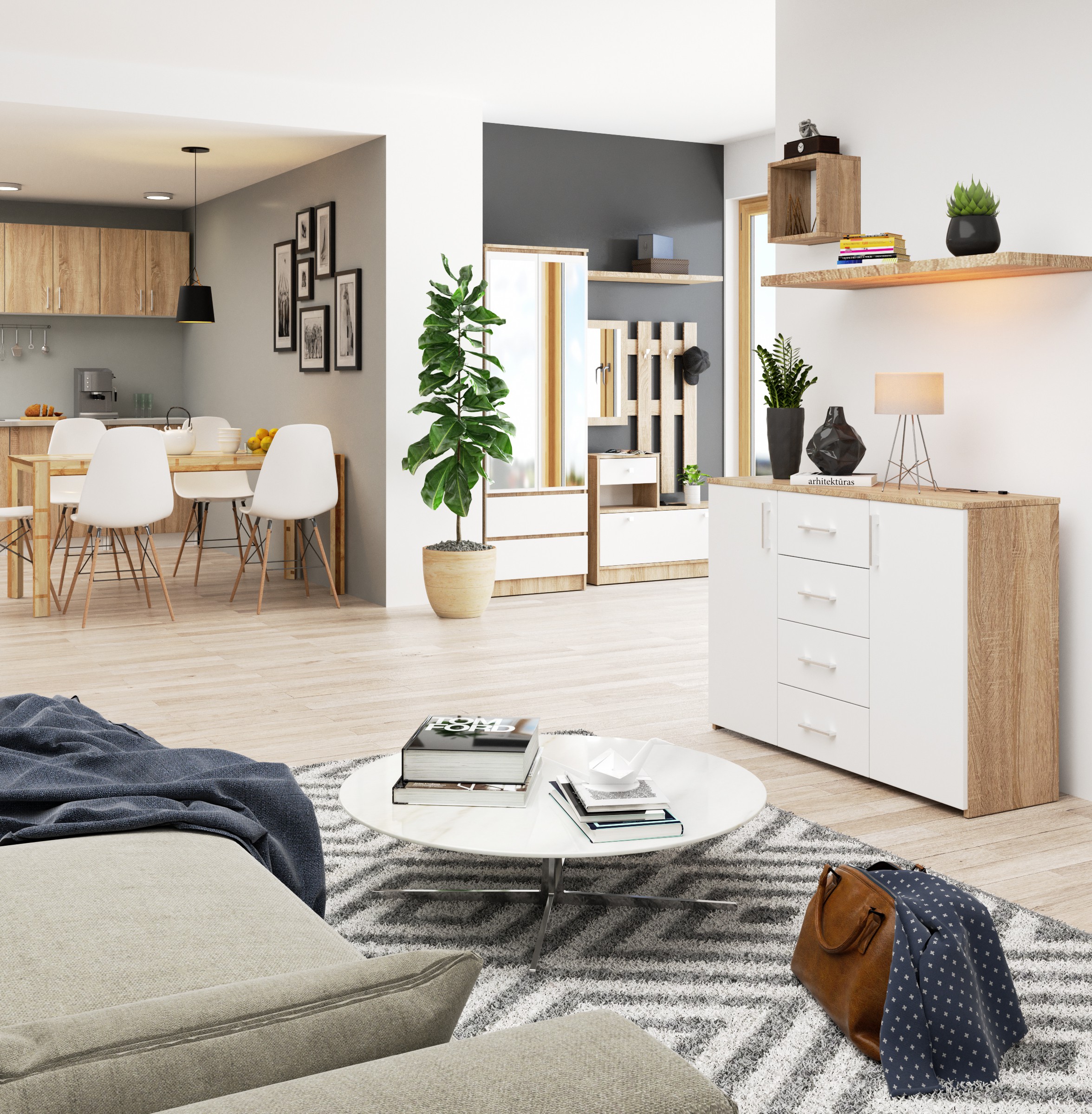 Commode AKORD K45 Chêne Sonoma 110 cm 2 portes 4 tiroirs façade Blanche 4 étagères 110x35x80 cm