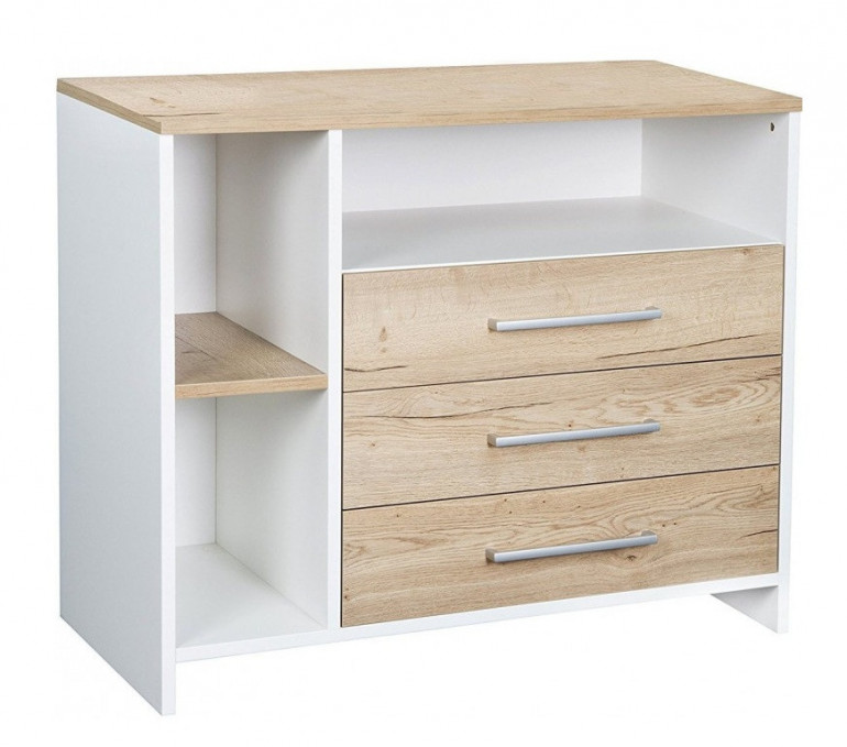 | Libellé | Commode avec plan à langer 3 tiroirs bois blanc et chêne clair Eco Plus L 113 x H 93 x P 54 cm |