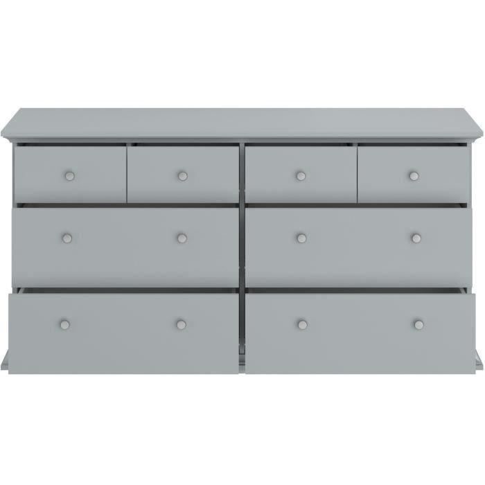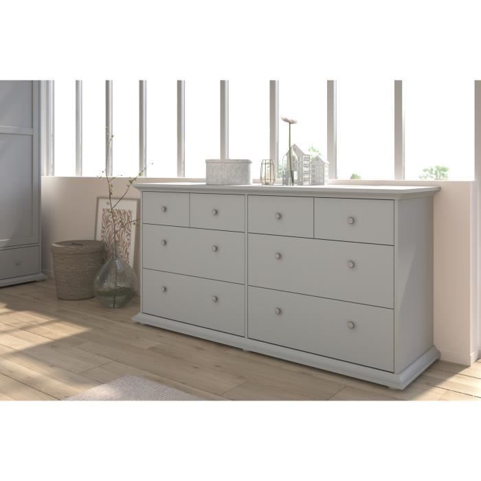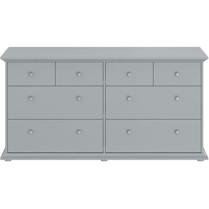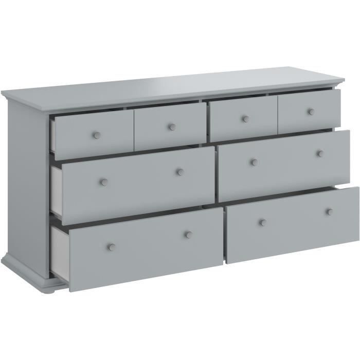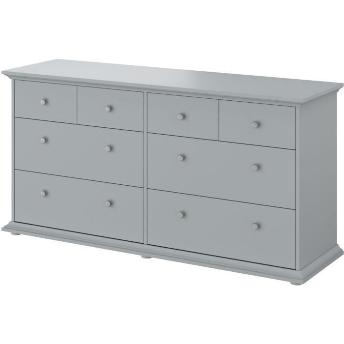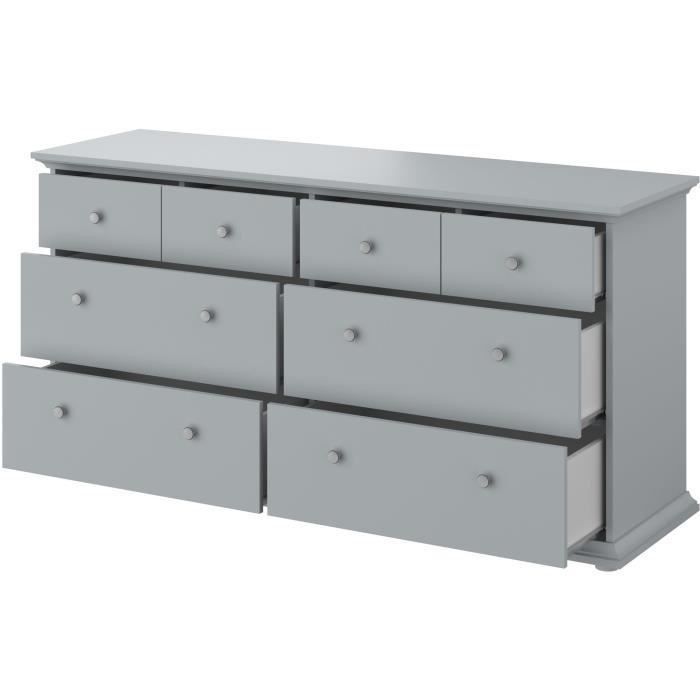 MANON Commode 8 tiroirs - Panneau de particules revetus de papier décor gris galet - 8 tiroirs - Corniche haute et basse en MDF enrobé qui apporte chic et élégance - Poignée métal finition patinée - Dimensions LxHxP : 152x77x46 cm