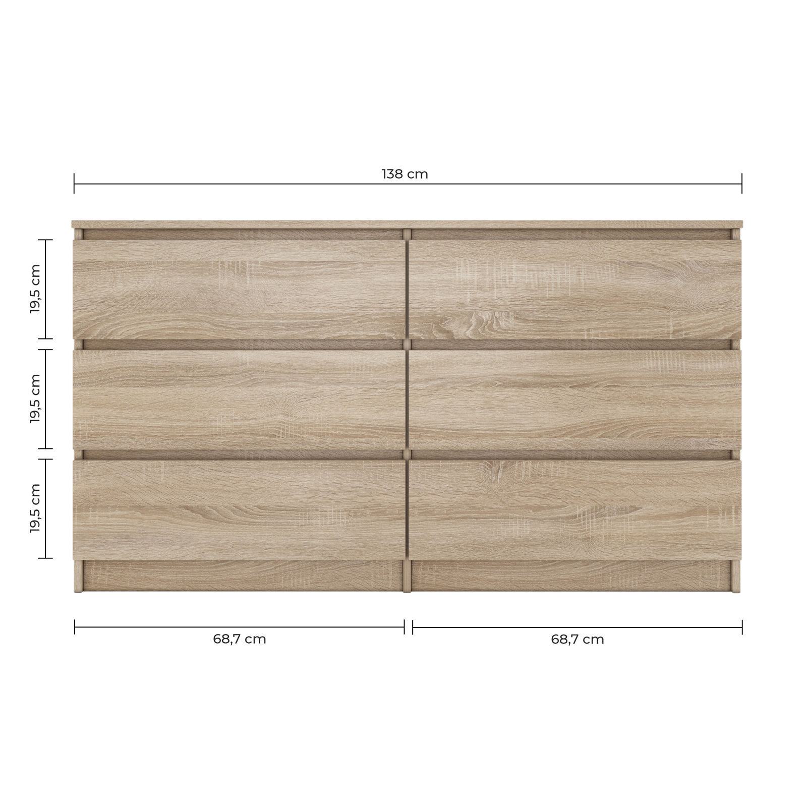 La commode design Malwa M6 a un look classique et intemporel qui répondra aux attentes de tous ceux qui apprécient la combinaison de la simplicité et de l'élégance. Cette commode moderne se compose de 6 tiroirs spacieux et pratiques. Les tiroirs sur les guides à rouleaux garantissent une utilisation confortable et sûre. Matériaux de haute qualité. Panneau aggloméré laminé. Bords - finit avec un matériau en PVC (caractérisé par une résistance mécanique et chimique élevée). DIMENSIONS : Profondeur : 40 cm Largeur : 138 cm Hauteur : 77 cm, Dimensions des tiroirs: 60x33x11cm (LxPxH)Photos des articles le plus fidèle possible, mais restant non contractuelles, les nuances de couleur et le rendu des matières présentés à l'écran pouvant être différents de la réalité