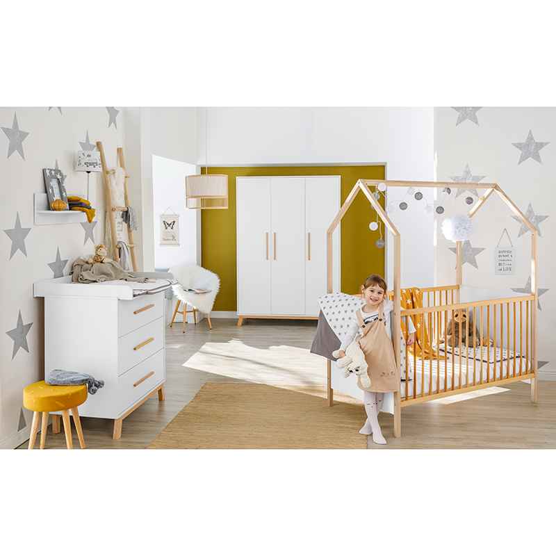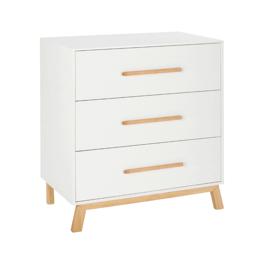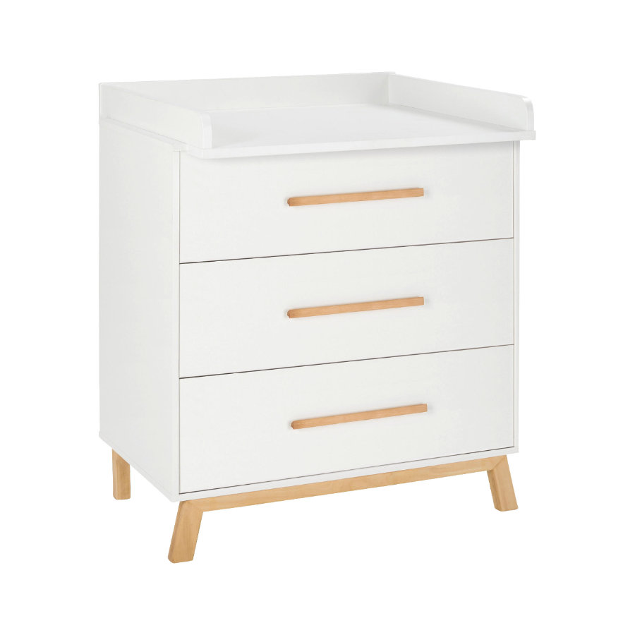 Décor blanc, 3 tiroirs à fermeture temporisée et rails de guidage latéraux extra résistants, poignées en hêtre massif, piètement en hêtre massif huilé nature. Table à langer amovible Hauteur à langer : 94 cm . H : 102 cm L : 90 cm P : 53/72 cm