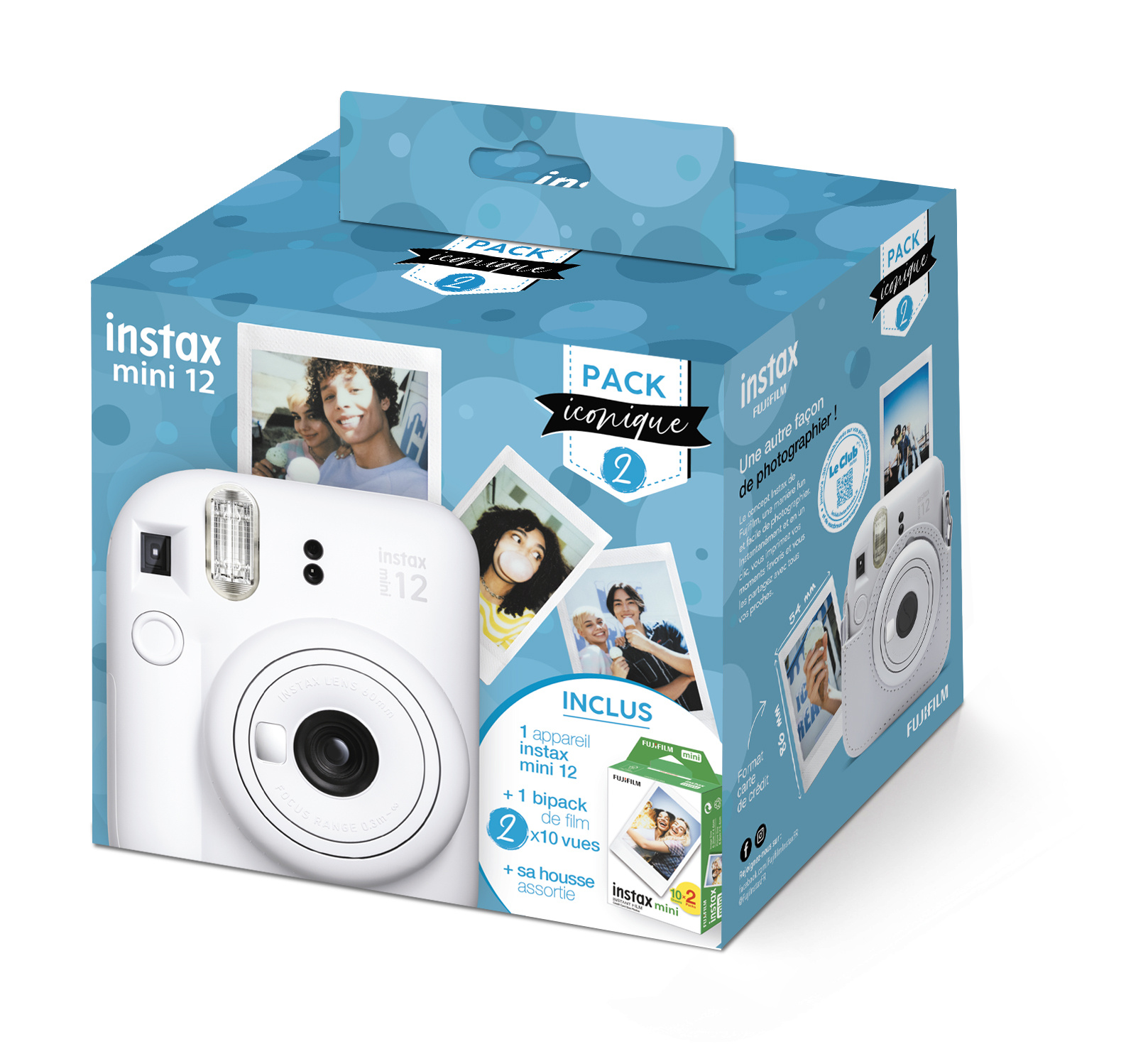 L’iconique appareil photo instantané Fujifilm se réinvente : l’instax mini 12 offre de nouvelles fonctionnalités pour encore plus de plaisir ! Il se décline dans un nouveau pack regroupant tous les indispensables d’une photo instantanée réussie. Et pour encore plus de plaisir, il contient maintenant un bipack de film instax mini, soit 20 photos ! Flashez pour ce nouveau « must-have » qui vous permettra de réaliser des photos de haute qualité, partout et n’importe quand ! Grâce à cette offre complète : Partagez vos instants les plus funs en prenant des photos au format instax mini Protégez et transportez partout votre appareil instax mini 12 grâce à la housse dédiée assortie Profitez de 2 fois plus de fun avec un bipack de film instax mini, soit 20 photos ! CONTENU DU PACK = 1 instax mini 12 Blanc + 1 Film Instax Mini Bipack (10X2 PK) + 1 housse mini 12 clay white