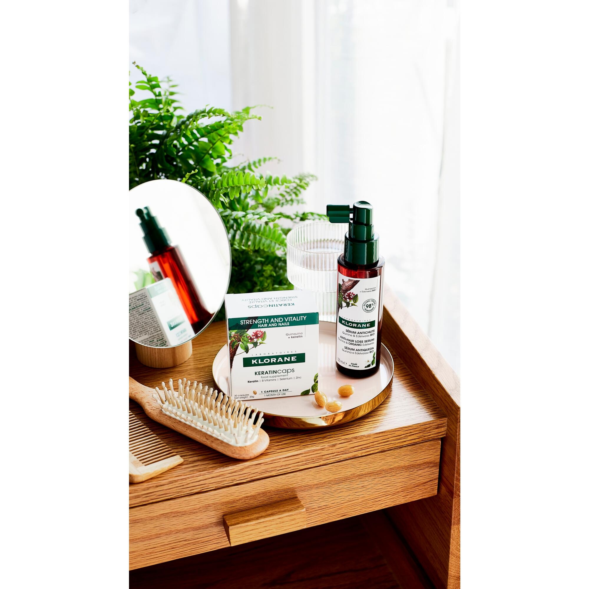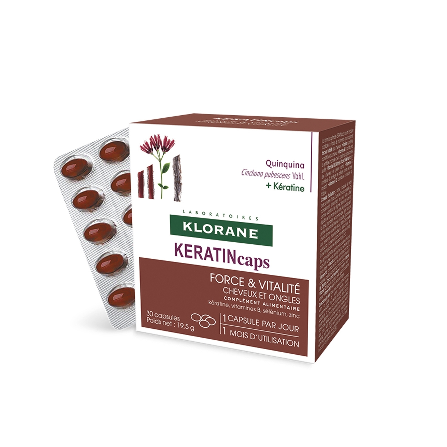 Le complément alimentaire KERATINcaps de Klorane est riche en micronutriments essentiels qui agissent à l’intérieur pour maintenir les cheveux forts et en bonne santé. Les gélules contiennent une formule à base d’extrait de Quinine, Vitamines B, Zinc, Sélénium et Kératine pour apporter force et vitalité aux cheveux fatigués. L’apport en micronutriments fortifiants revigore les cheveux et renforce la tige capillaire. Cure de 3 mois, à raison d’une capsule par jour.