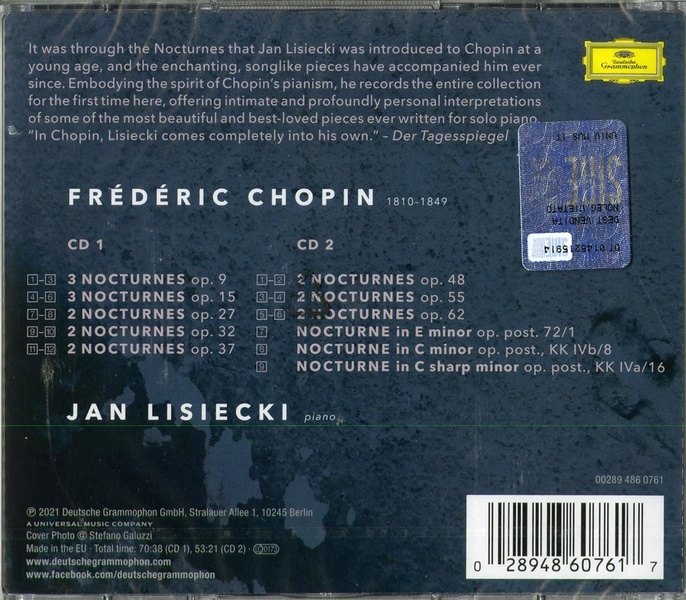 Pour son huitième album chez Deutsche Grammophon, le talentueux pianiste canadien Jan Lisiecki rend hommage aux nocturnes de Frédéric Chopin. 'Complete Nocturnes' propose des interprétations profondément personnelles de certains des plus belles oeuvres jamais écrites pour piano. Le pianiste, souvent célébré pour ses lectures magistralement sensibles et sophistiquées, ne se contente pas de capturer l'esprit de l'art du clavier de Chopin piano mais représente également l'époque et les circonstances dans lesquelles ces oeuvres ont été écrites.