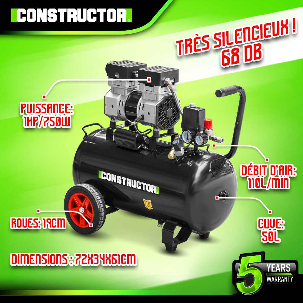 Compresseur 750W - 50L silencieux - 8 bars - Constructor