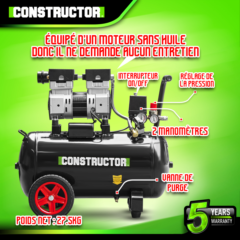 | Libellé | Compresseur 750W - 50L silencieux - 8 bars - Constructor |