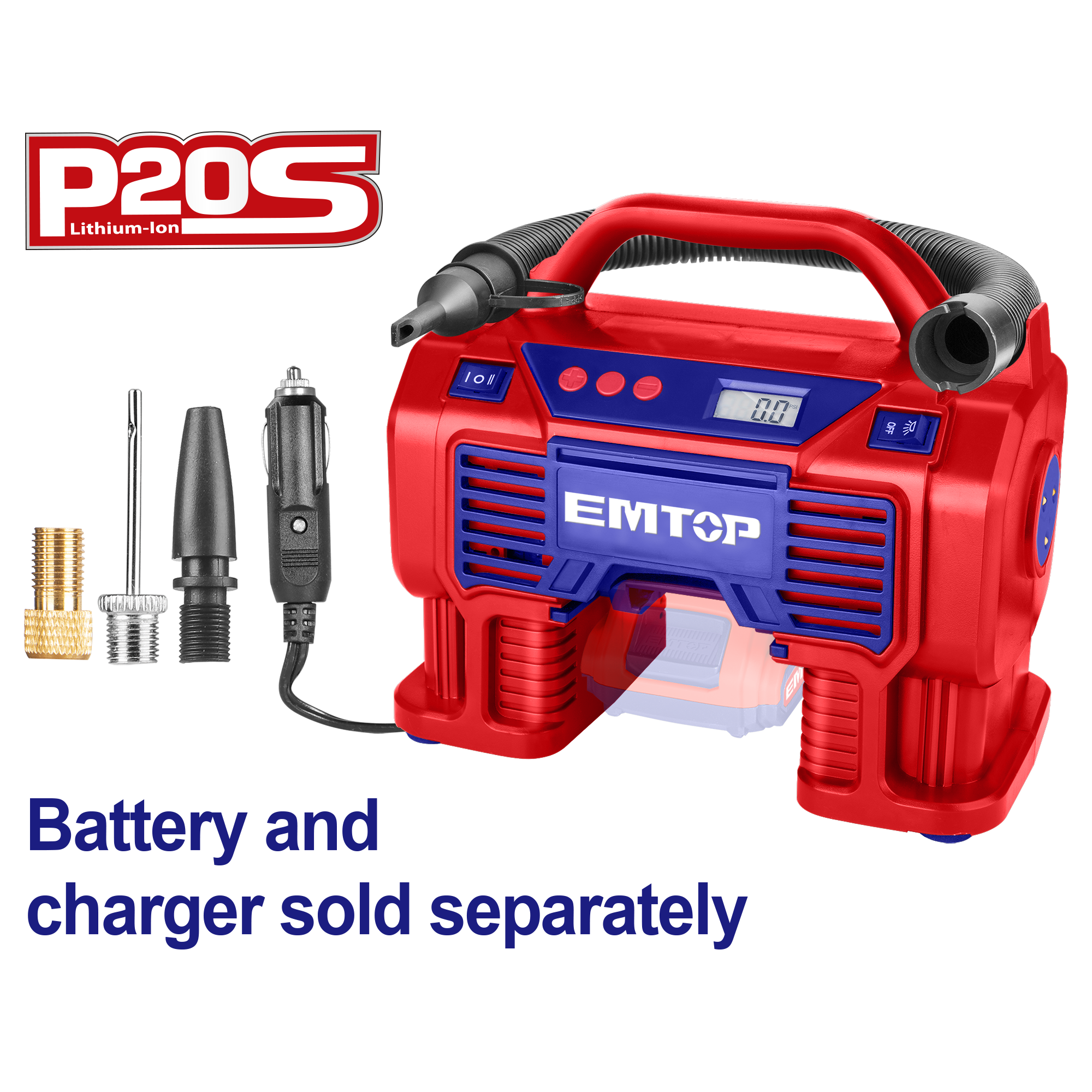 Compresseur portatif à batterie EMTOP 20V batterie et chargeur vendus séparément Chargeur Voiture 12V ou par batterie Pression 11 BAR, Machine d'atelier, Compresseur portatif, Pompe pneumatique sans-fil, Compresseur et outil pneumatique, Compresseur d'air