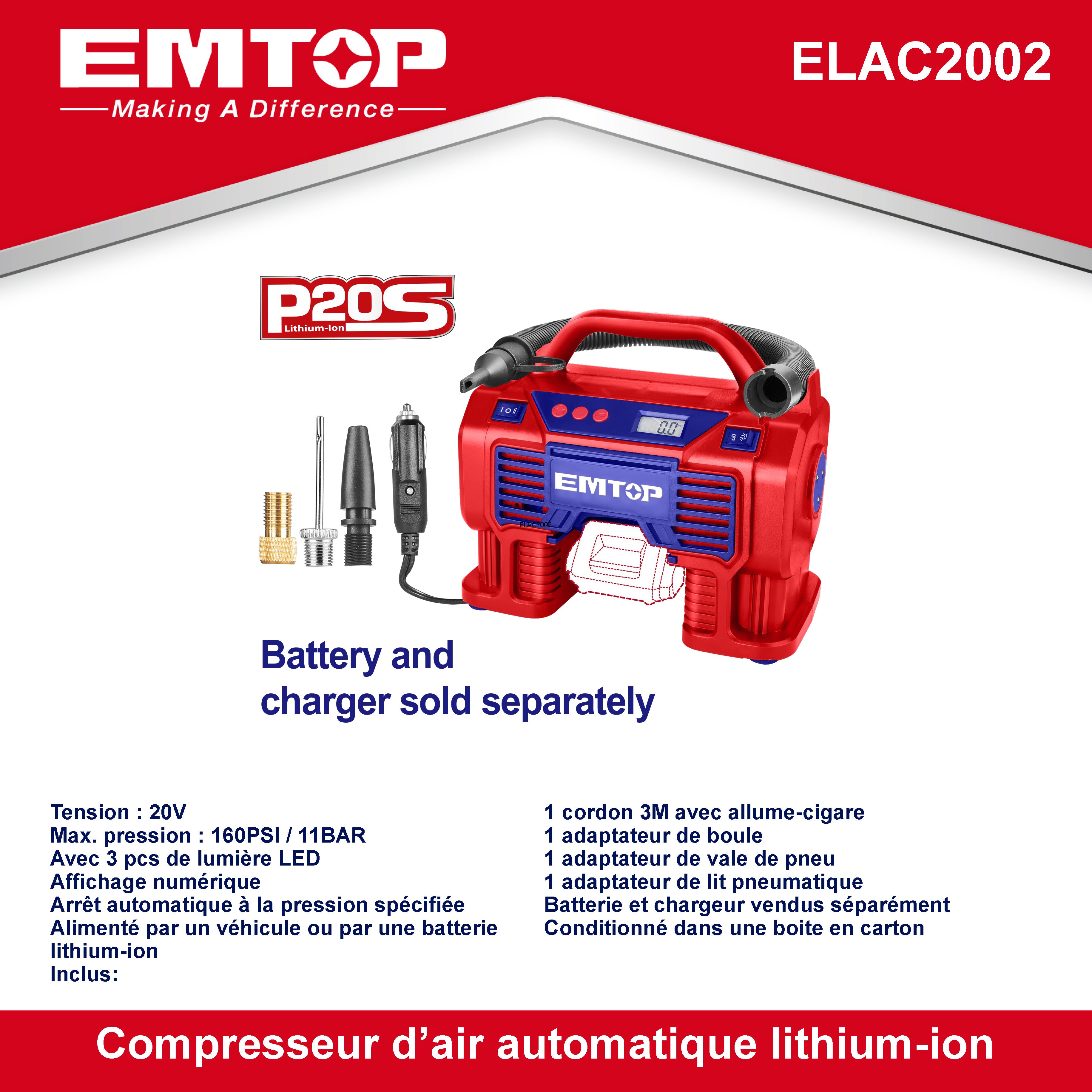 Libellé Compresseur à batterie pompe à air sans fil EMTOP 20V batterie et chargeur vendus séparément Chargeur Voiture 12V ou par batterie Pression 11 BAR+EMT