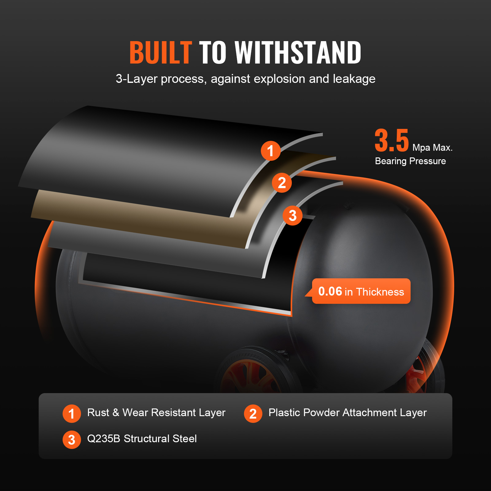 Conçu pour Résister : Notre compresseur d'air électrique est construit à partir d'un processus à 3 couches : couche résistante à la rouille et à l'usure, couche de fixation en poudre plastique et acier structurel Q235B fournissant une durabilité et une résistance ultime à la rouille. Une pression d'appui maximale de 3,5 MPa et une construction soudée sans soudure assurent la capacité de résister aux explosions et aux fuites.